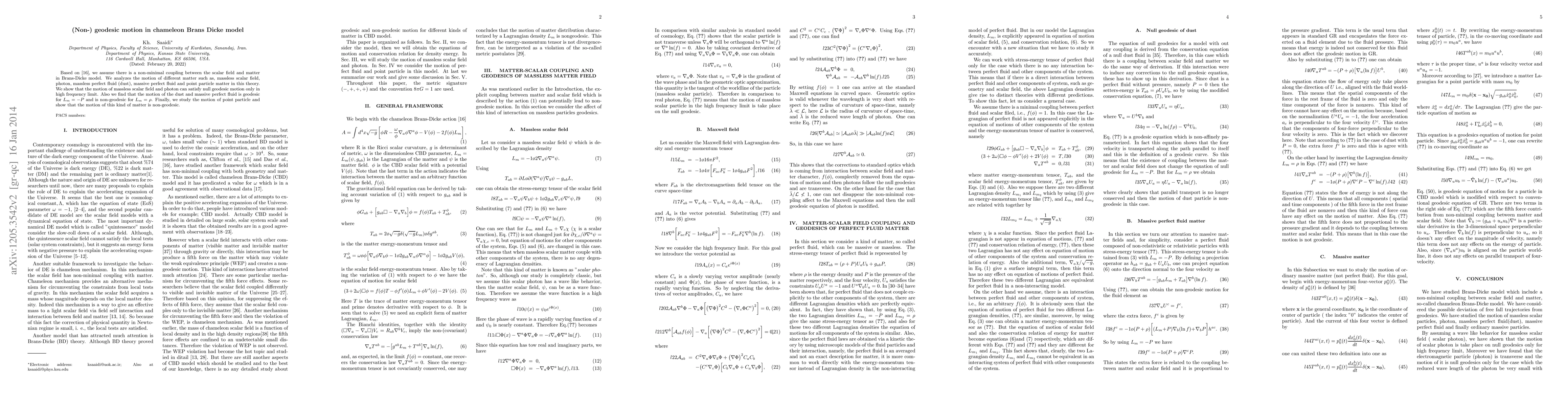 This paper explores the motion of various types of matter in a modified Brans-Dicke model with non-minimal scalar field coupling. It finds that while massless scalar fields and photons follow null geodesics only at high frequencies, dust and massive perfect fluids exhibit geodesic motion under specific conditions, whereas point particles always move non-geodesically.