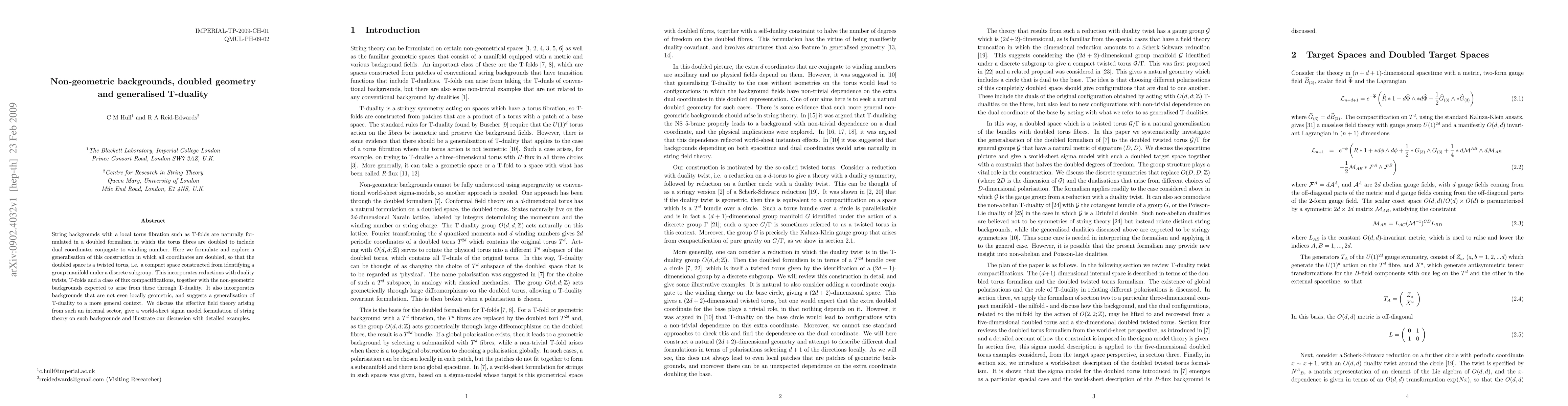 This paper explores a generalised T-duality framework for non-geometric string backgrounds, using a doubled geometry approach where all coordinates are doubled, forming a twisted torus. It discusses effective field theories, a world-sheet sigma model formulation, and provides examples to illustrate these concepts.
