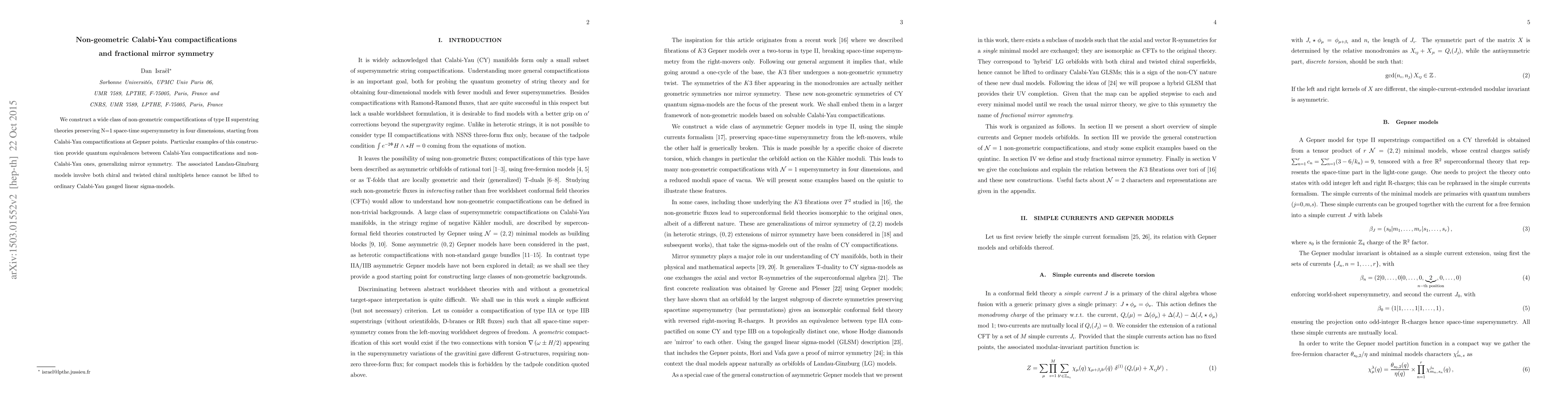 This paper constructs non-geometric Calabi-Yau compactifications preserving N=1 supersymmetry in four dimensions, extending mirror symmetry to include non-Calabi-Yau spaces via fractional mirror symmetry. These compactifications are derived from Gepner points and involve Landau-Ginzburg models with multiple types of multiplets.