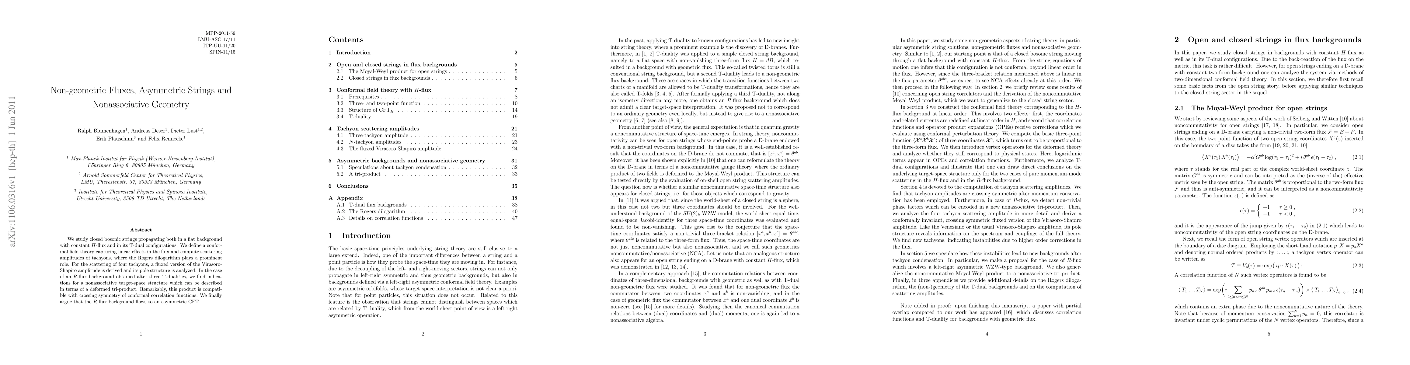 We study closed bosonic strings propagating both in a flat background with constant H-flux and in its T-dual configurations. We define a conformal field theory capturing linear effects in the flux and compute scattering amplitudes of tachyons, where the Rogers dilogarithm plays a prominent role. For the scattering of four tachyons, a fluxed version of the Virasoro-Shapiro amplitude is derived and its pole structure is analyzed. In the case of an R-flux background obtained after three T-dualities, we find indications for a nonassociative target-space structure which can be described in terms of a deformed tri-product. Remarkably, this product is compatible with crossing symmetry of conformal correlation functions. We finally argue that the R-flux background flows to an asymmetric CFT.