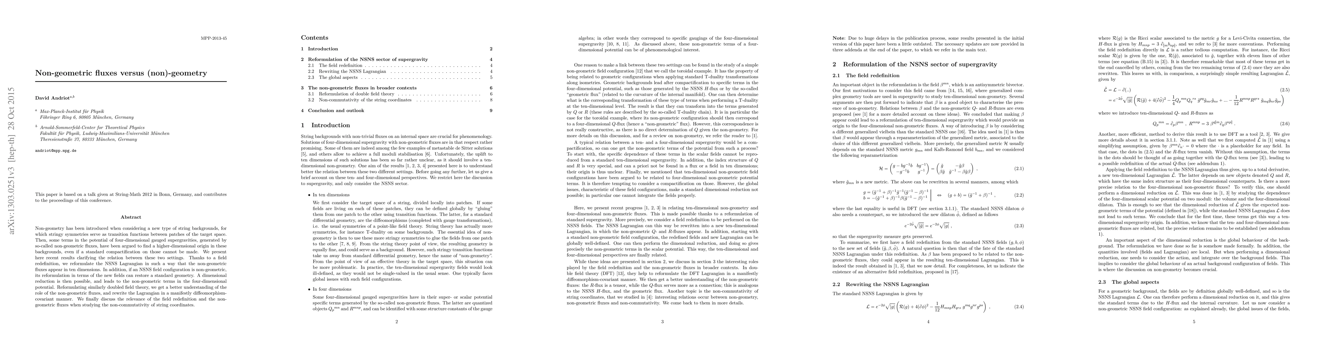Non-geometry has been introduced when considering a new type of string backgrounds, for which stringy symmetries serve as transition functions between patches of the target space. Then, some terms in the potential of four-dimensional gauged supergravities, generated by so-called non-geometric fluxes, have been argued to find a higher-dimensional origin in these backgrounds, even if a standard compactification on those cannot be made. We present here recent results clarifying the relation between these two settings. Thanks to a field redefinition, we reformulate the NSNS Lagrangian in such a way that the non-geometric fluxes appear in ten dimensions. In addition, if an NSNS field configuration is non-geometric, its reformulation in terms of the new fields can restore a standard geometry. A dimensional reduction is then possible, and leads to the non-geometric terms in the four-dimensional potential. Reformulating similarly doubled field theory, we get a better understanding of the role of the non-geometric fluxes, and rewrite the Lagrangian in a manifestly diffeomorphism-covariant manner. We finally discuss the relevance of the field redefinition and the non-geometric fluxes when studying the non-commutativity of string coordinates.