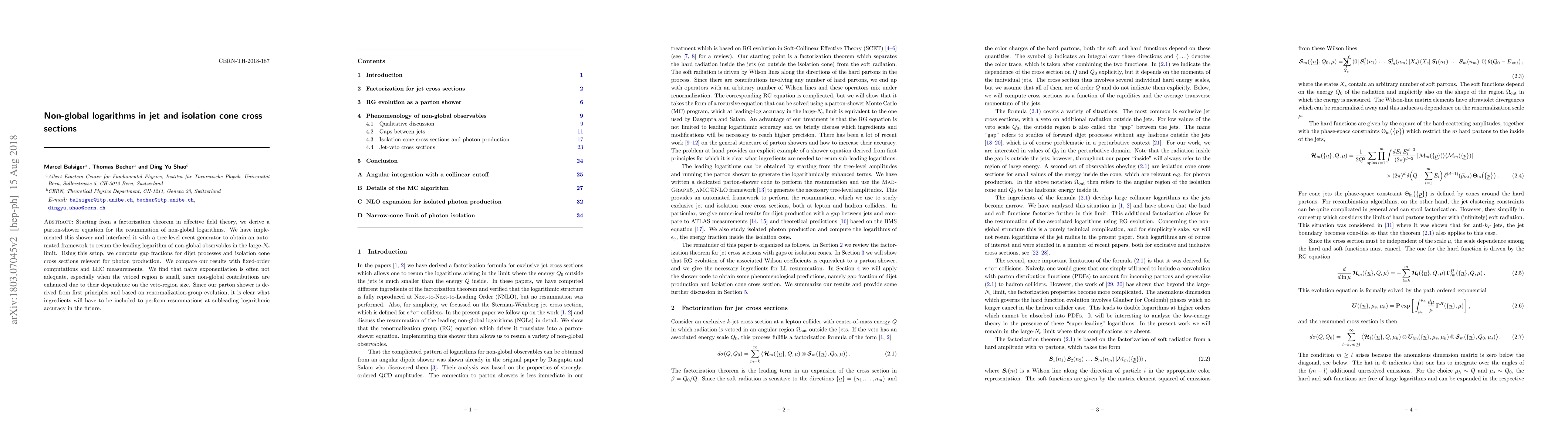 Starting from a factorization theorem in effective field theory, we derive a parton-shower equation for the resummation of non-global logarithms. We have implemented this shower and interfaced it with a tree-level event generator to obtain an automated framework to resum the leading logarithm of non-global observables in the large-$N_c$ limit. Using this setup, we compute gap fractions for dijet processes and isolation cone cross sections relevant for photon production. We compare our results with fixed-order computations and LHC measurements. We find that naive exponentiation is often not adequate, especially when the vetoed region is small, since non-global contributions are enhanced due to their dependence on the veto-region size. Since our parton shower is derived from first principles and based on renormalization-group evolution, it is clear what ingredients will have to be included to perform resummations at subleading logarithmic accuracy in the future.