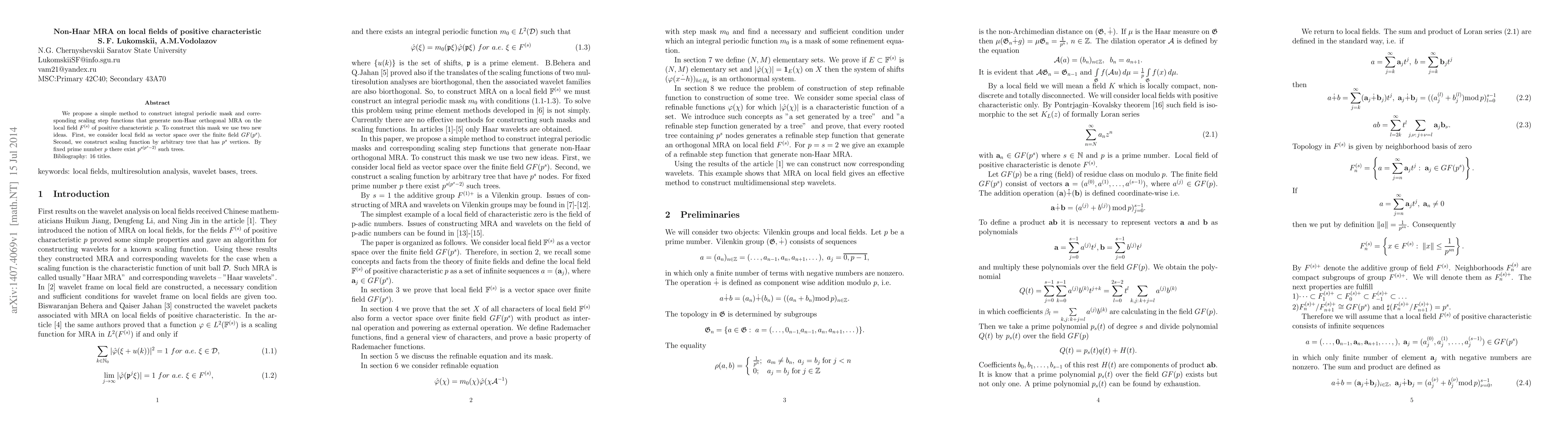 We propose a simple method to construct integral periodic mask and corresponding scaling step functions that generate non-Haar orthogonal MRA on the local field $ F^{(s)}$ of positive characteristic $p$. To construct this mask we use two new ideas. First, we consider local field as vector space over the finite field $GF(p^s)$. Second, we construct scaling function by arbitrary tree that has $p^s$ vertices. By fixed prime number $p$ there exist $p^{s(p^s-2)}$ such trees.