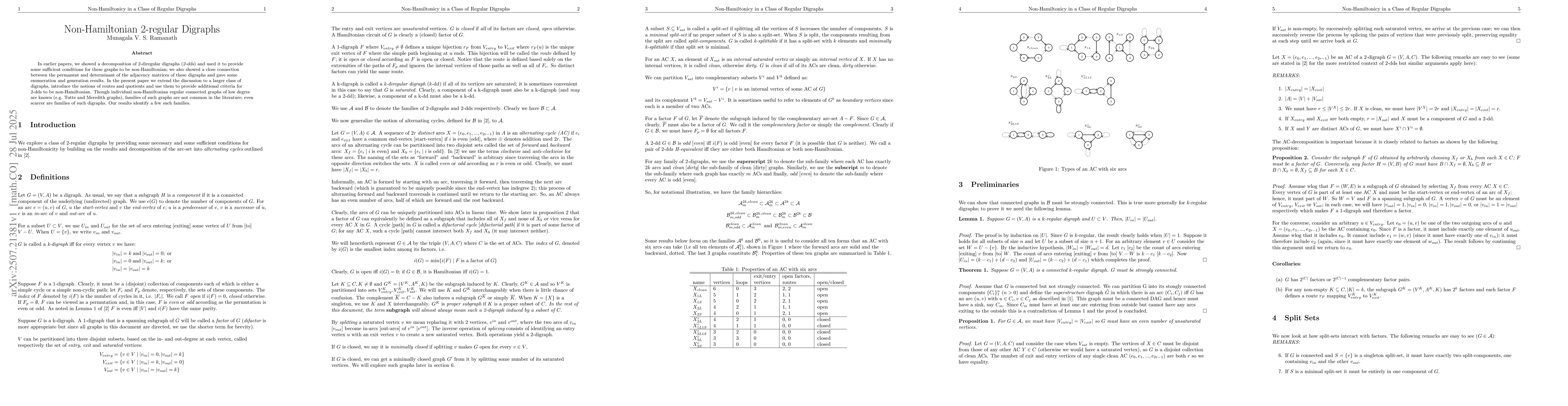 In earlier papers, we showed a decomposition of 2-diregular digraphs (2-dds) and used it to provide some sufficient conditions for these graphs to be non-Hamiltonian; we also showed a close connection between the permanent and determinant of the adjacency matrices of these digraphs and gave some enumeration and generation results. In the present paper we extend the discussion to a larger class of digraphs, introduce the notions of routes and quotients and use them to provide additional criteria for 2-dds to be non-Hamiltonian. Though individual non-Hamiltonian regular connected graphs of low degree are known (e.g. Tutte and Meredith graphs), families of such graphs are not common in the literature; even scarcer are families of such digraphs. Our results identify a few such families.