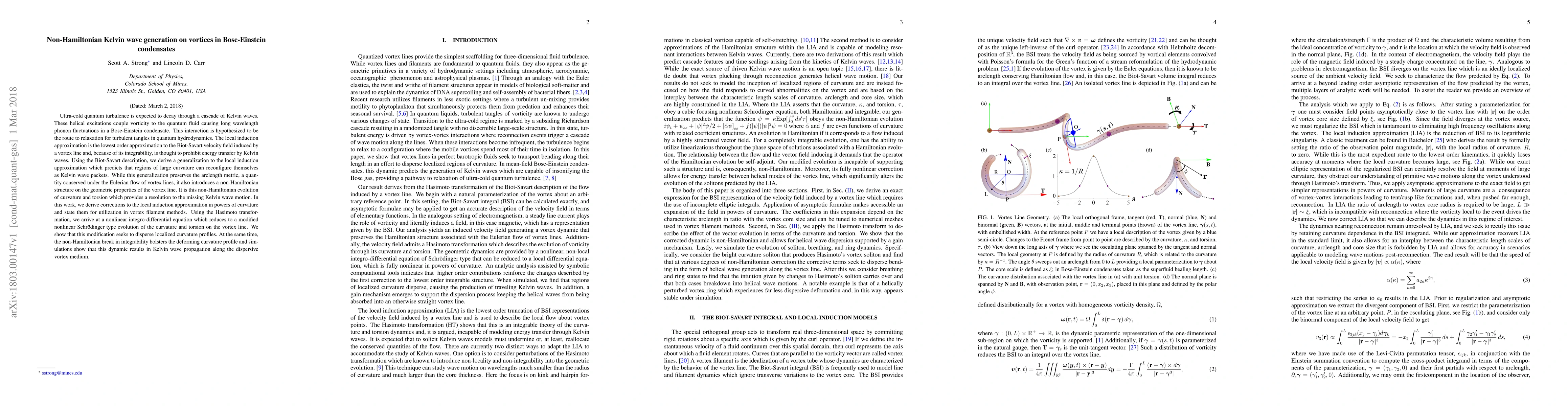 Ultra-cold quantum turbulence is expected to decay through a cascade of Kelvin waves. These helical excitations couple vorticity to the quantum fluid causing long wavelength phonon fluctuations in a Bose-Einstein condensate. This interaction is hypothesized to be the route to relaxation for turbulent tangles in quantum hydrodynamics. The local induction approximation is the lowest order approximation to the Biot-Savart velocity field induced by a vortex line and, because of its integrability, is thought to prohibit energy transfer by Kelvin waves. Using the Biot-Savart description, we derive a generalization to the local induction approximation which predicts that regions of large curvature can reconfigure themselves as Kelvin wave packets. While this generalization preserves the arclength metric, a quantity conserved under the Eulerian flow of vortex lines, it also introduces a non-Hamiltonian structure on the geometric properties of the vortex line. It is this non-Hamiltonian evolution of curvature and torsion which provides a resolution to the missing Kelvin wave motion. In this work, we derive corrections to the local induction approximation in powers of curvature and state them for utilization in vortex filament methods. Using the Hasimoto transformation, we arrive at a nonlinear integro-differential equation which reduces to a modified nonlinear Schr\"odinger type evolution of the curvature and torsion on the vortex line. We show that this modification seeks to disperse localized curvature profiles. At the same time, the non-Hamiltonian break in integrability bolsters the deforming curvature profile and simulations show that this dynamic results in Kelvin wave propagation along the dispersive vortex medium.
