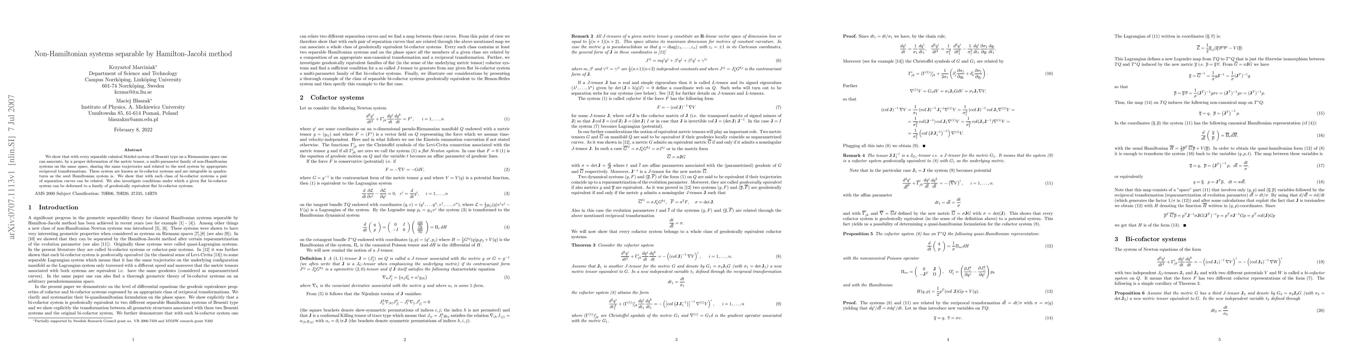 We show that with every separable calssical Stackel system of Benenti type on a Riemannian space one can associate, by a proper deformation of the metric tensor, a multi-parameter family of non-Hamiltonian systems on the same space, sharing the same trajectories and related to the seed system by appropriate reciprocal transformations. These system are known as bi-cofactor systems and are integrable in quadratures as the seed Hamiltonian system is. We show that with each class of bi-cofactor systems a pair of separation curves can be related. We also investigate conditions under which a given flat bi-cofactor system can be deformed to a family of geodesically equivalent flat bi-cofactor systems.