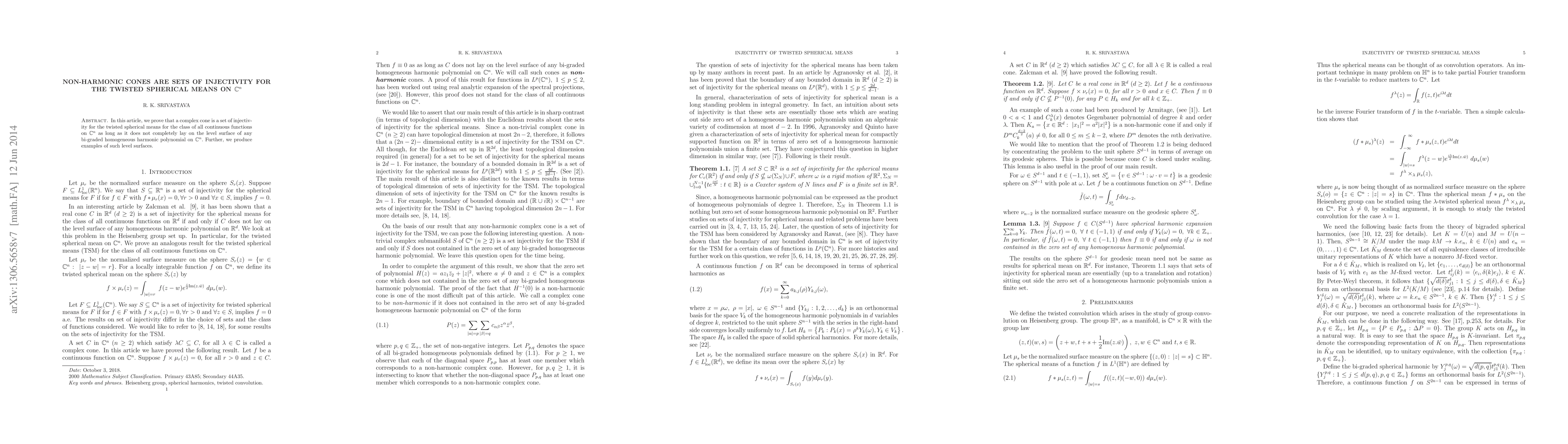 This paper demonstrates that non-harmonic complex cones serve as sets of injectivity for twisted spherical means for continuous functions on $\mathbb C^n$, provided they do not align with level surfaces of bi-graded homogeneous harmonic polynomials. It also provides examples of such level surfaces.