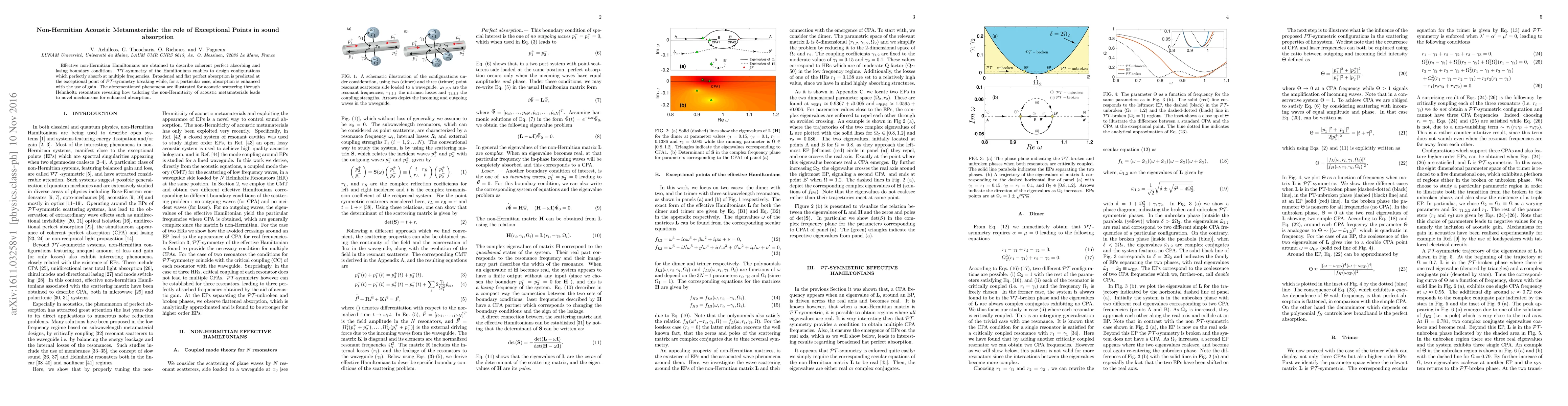 Effective non-Hermitian Hamiltonians are obtained to describe coherent perfect absorbing and lasing boundary conditions. PT -symmetry of the Hamiltonians enables to design configurations which perfectly absorb at multiple frequencies. Broadened and flat perfect absorption is predicted at the exceptional point of PT -symmetry breaking while, for a particular case, absorption is enhanced with the use of gain. The aforementioned phenomena are illustrated for acoustic scattering through Helmholtz resonators revealing how tailoring the non-Hermiticity of acoustic metamaterials leads to novel mechanisms for enhanced absorption.