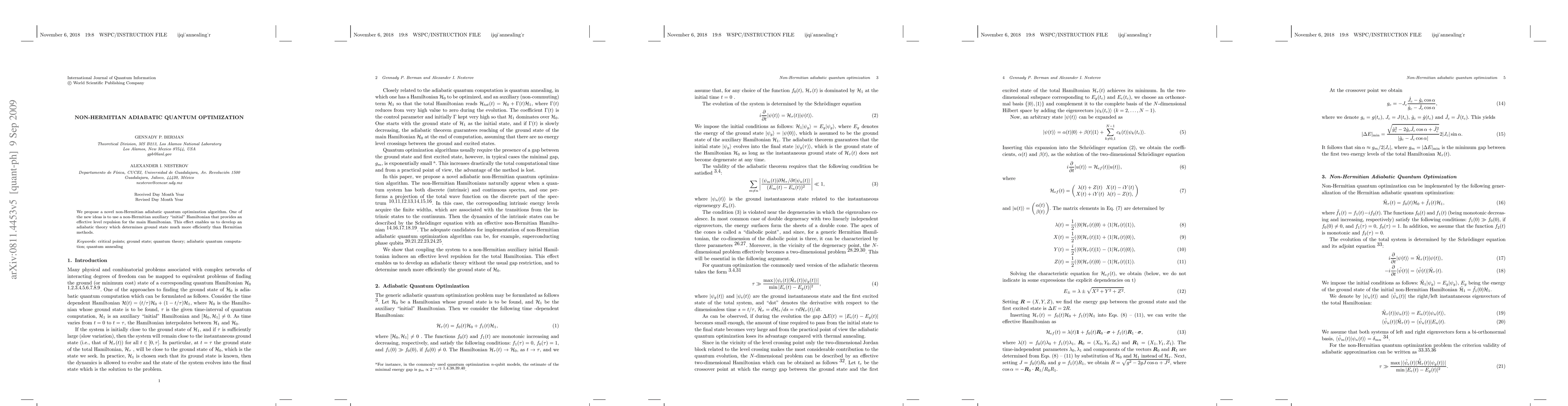 Summary: This paper introduces a novel non-Hermitian adiabatic quantum optimization algorithm that employs a non-Hermitian auxiliary Hamiltonian to achieve effective level repulsion, significantly improving ground state determination efficiency compared to Hermitian methods.