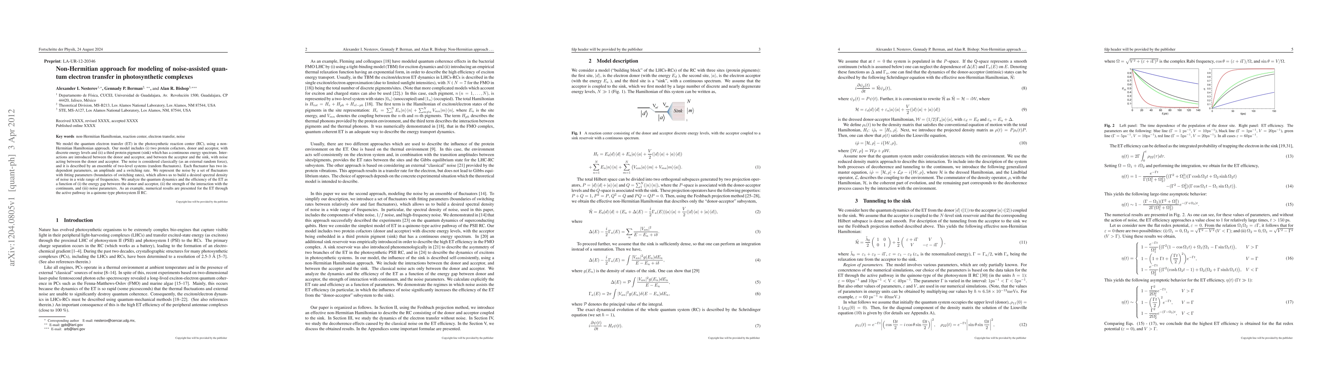This paper models quantum electron transfer in photosynthetic complexes using a non-Hermitian Hamiltonian approach, incorporating discrete and continuous energy levels, interactions, and noise from an ensemble of two-level systems. The study analyzes the dynamics and efficiency of electron transfer under varying energy gaps, interaction strengths, and noise parameters.