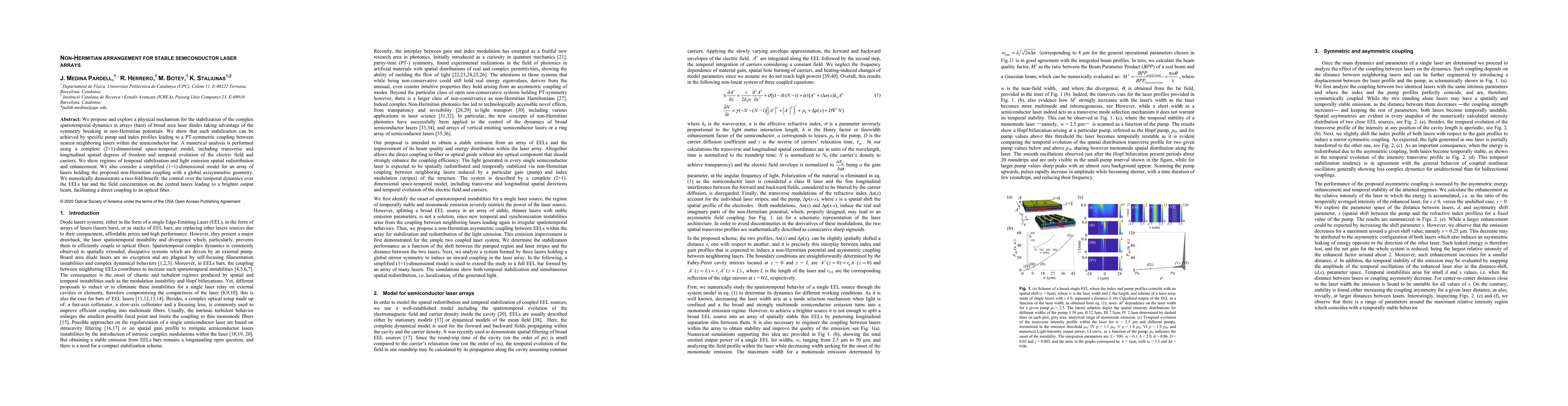 We propose and explore a physical mechanism for the stabilization of the complex spatiotemporal dynamics in arrays (bars) of broad area laser diodes taking advantage of the symmetry breaking in non-Hermitian potentials. We show that such stabilization can be achieved by specific pump and index profiles leading to a PT-symmetric coupling between nearest neighboring lasers within the semiconductor bar. A numerical analysis is performed using a complete (2+1)-dimensional space-temporal model, including transverse and longitudinal spatial degrees of freedom and temporal evolution of the electric field and carriers. We show regimes of temporal stabilization and light emission spatial redistribution and enhancement. We also consider a simplified (1+1)-dimensional model for an array of lasers holding the proposed non-Hermitian coupling with a global axisymmetric geometry. We numerically demonstrate a two-fold benefit: the control over the temporal dynamics over the EELs bar and the field concentration on the central lasers leading to a brighter output beam, facilitating a direct coupling to an optical fiber.
