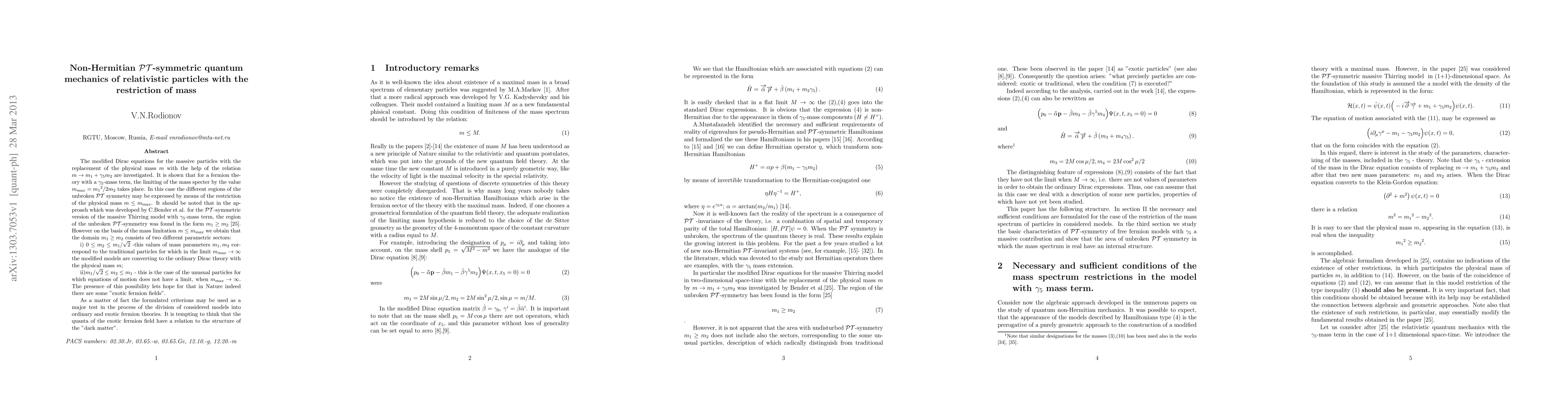 The modified Dirac equations for the massive particles with the replacement of the physical mass $m$ with the help of the relation $m\rightarrow m_1+ \gamma_5 m_2$ are investigated. It is shown that for a fermion theory with a $\gamma_5$-mass term, the limiting of the mass specter by the value $ m_{max}= {m_1}^2/2m_2$ takes place. In this case the different regions of the unbroken $\cal PT$ symmetry may be expressed by means of the restriction of the physical mass $m\leq m_{max}$. It should be noted that in the approach which was developed by C.Bender et al. for the $\cal PT$-symmetric version of the massive Thirring model with $\gamma_5$-mass term, the region of the unbroken $\cal PT$-symmetry was found in the form $m_1\geq m_2$ \cite{ft12}. However on the basis of the mass limitation $m\leq m_{max}$ we obtain that the domain $m_1\geq m_2$ consists of two different parametric sectors: i) $0\leq m_2 \leq m_1/\sqrt{2}$ -this values of mass parameters $m_1,m_2$ correspond to the traditional particles for which in the limit $m_{max}\rightarrow \infty$ the modified models are converting to the ordinary Dirac theory with the physical mass $m$; ii)$m_1/\sqrt{2}\leq m_2 \leq m_1$ - this is the case of the unusual particles for which equations of motion does not have a limit, when $m_{max}\rightarrow \infty$. The presence of this possibility lets hope for that in Nature indeed there are some "exotic fermion fields". As a matter of fact the formulated criterions may be used as a major test in the process of the division of considered models into ordinary and exotic fermion theories. It is tempting to think that the quanta of the exotic fermion field have a relation to the structure of the "dark matter".