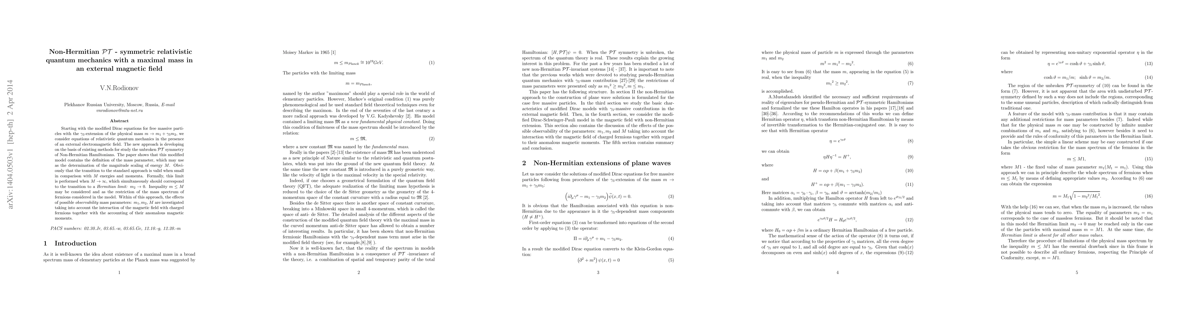 Starting with the modified Dirac equations for free massive particles with the $\gamma_5$-extension of the physical mass $m\rightarrow m_1 + \gamma_5 m_2$, we consider equations of relativistic quantum mechanics in the presence of an external electromagnetic field. The new approach is developing on the basis of existing methods for study the unbroken $\cal PT$ symmetry of Non-Hermitian Hamiltonians. The paper shows that this modified model contains the definition of the mass parameter, which may use as the determination of the magnitude scaling of energy $M$. Obviously that the transition to the standard approach is valid when small in comparison with $M$ energies and momenta. Formally, this limit is performed when $M\rightarrow\infty$, which simultaneously should correspond to the transition to a \emph{Hermitian limit}$m_2\rightarrow 0$. Inequality $m \leq M$ may be considered and as the restriction of the mass spectrum of fermions considered in the model. Within of this approach, the effects of possible \emph{observability} mass parameters: $m_1, m_2$, $M$ are investigated taking into account the interaction of the magnetic field with charged fermions together with the accounting of their anomalous magnetic moments.