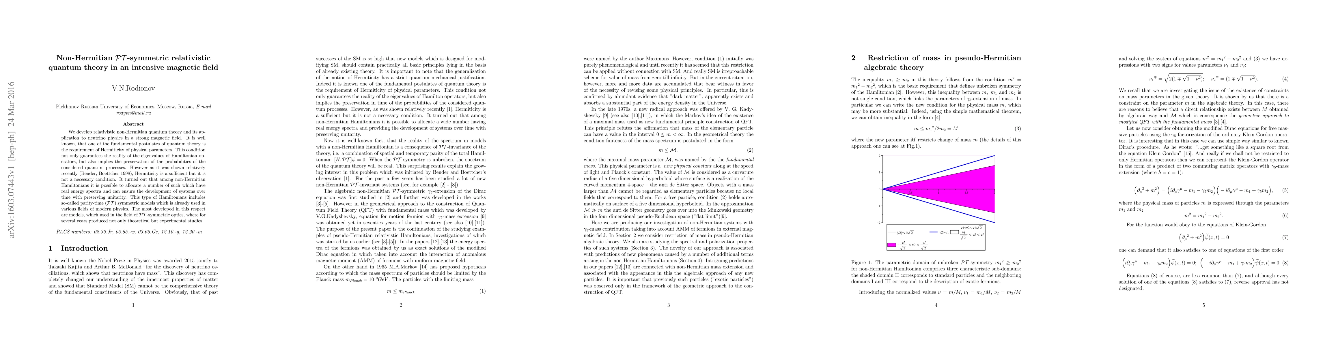 We develop relativistic non-Hermitian quantum theory and its application to neutrino physics in a strong magnetic field. It is well known, that one of the fundamental postulates of quantum theory is the requirement of Hermiticity of physical parameters. This condition not only guarantees the reality of the eigenvalues of Hamiltonian operators, but also implies the preservation of the probabilities of the considered quantum processes. However as it was shown relatively recently (Bender, Boettcher 1998), Hermiticity is a sufficient but it is not a necessary condition. It turned out that among non-Hermitian Hamiltonians it is possible to allocate a number of such which have real energy spectra and can ensure the development of systems over time with preserving unitarity. This type of Hamiltonians includes so-called parity-time (${\cal PT}$) symmetric models which is already used in various fields of modern physics. The most developed in this respect are models, which used in the field of ${\cal PT}$-symmetric optics, where for several years produced not only theoretical but experimental studies.