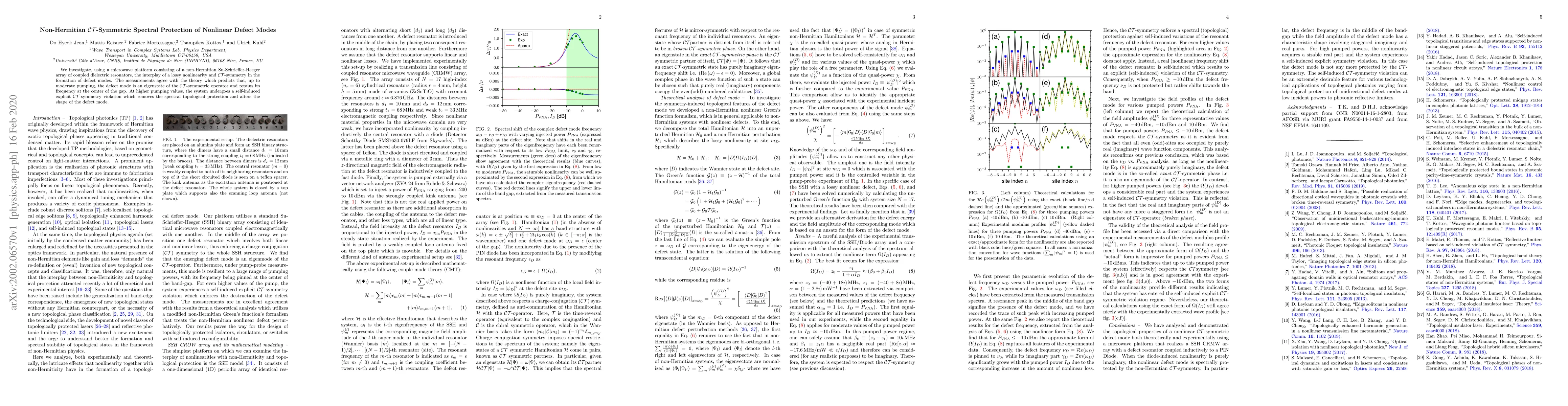 We investigate, using a microwave platform consisting of a non-Hermitian Su-Schrieffer-Heeger array of coupled dielectric resonators, the interplay of a lossy nonlinearity and CT-symmetry in the formation of defect modes. The measurements agree with the theory which predicts that, up to moderate pumping, the defect mode is an eigenstate of the CT-symmetric operator and retains its frequency at the center of the gap. At higher pumping values, the system undergoes a self-induced explicit \CT-symmetry violation which removes the spectral topological protection and alters the shape of the defect mode.