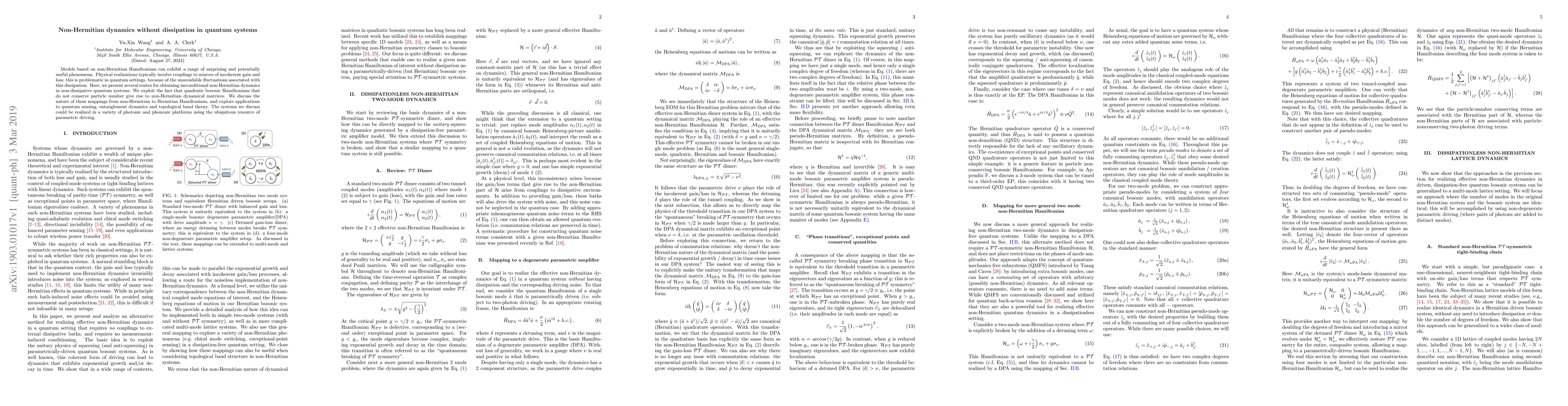 Models based on non-Hermitian Hamiltonians can exhibit a range of surprising and potentially useful phenomena. Physical realizations typically involve couplings to sources of incoherent gain and loss; this is problematic in quantum settings, because of the unavoidable fluctuations associated with this dissipation. Here, we present several routes for obtaining unconditional non-Hermitian dynamics in non-dissipative quantum systems. We exploit the fact that quadratic bosonic Hamiltonians that do not conserve particle number give rise to non-Hermitian dynamical matrices. We discuss the nature of these mappings from non-Hermitian to Hermitian Hamiltonians, and explore applications to quantum sensing, entanglement dynamics and topological band theory. The systems we discuss could be realized in a variety of photonic and phononic platforms using the ubiquitous resource of parametric driving.