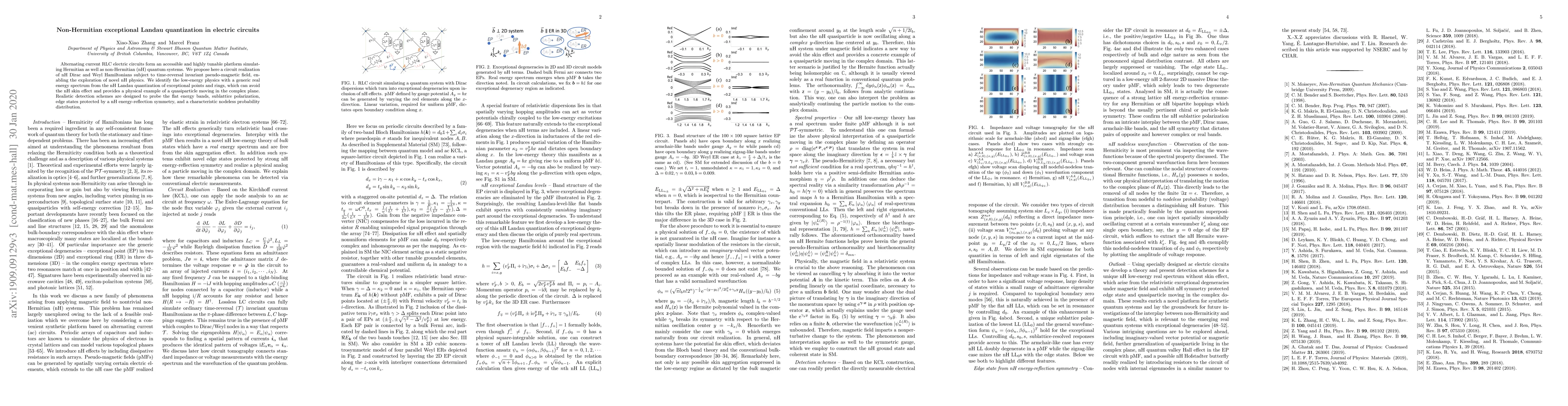 This paper proposes an electric circuit model to simulate non-Hermitian (nH) quantum systems, specifically nH Dirac and Weyl Hamiltonians. It explores nH Landau quantization at exceptional points and rings, demonstrating a quasiparticle motion in the complex plane, and provides realistic detection schemes for its unique properties.