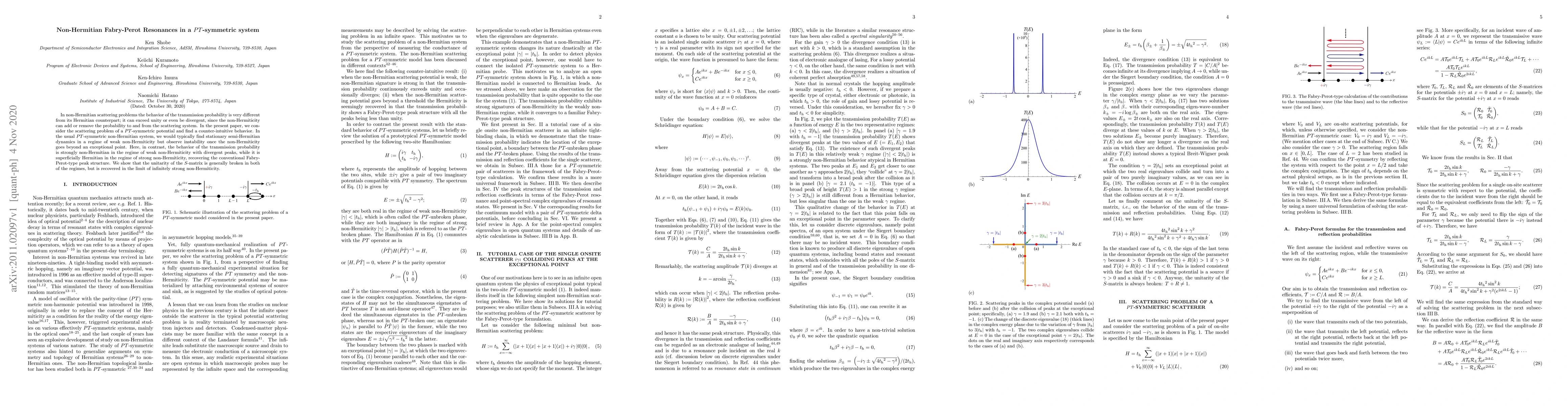 In non-Hermitian scattering problems the behavior of the transmission probability is very different from its Hermitian counterpart; it can exceed unity or even be divergent, since the non-Hermiticity can add or remove the probability to and from the scattering system. In the present paper, we consider the scattering problem of a PT-symmetric potential and find a counter-intuitive behavior. In the usual PT-symmetric non-Hermitian system, we would typically find stationary semi-Hermitian dynamics in a regime of weak non-Hermiticity but observe instability once the non-Hermiticity goes beyond an exceptional point. Here, in contrast, the behavior of the transmission probability is strongly non-Hermitian in the regime of weak non-Hermiticity with divergent peaks, while it is superficially Hermitian in the regime of strong non-Hermiticity, recovering the conventional Fabry-Perot-type peak structure. We show that the unitarity of the S-matrix is generally broken in both of the regimes, but is recovered in the limit of infinitely strong non-Hermiticity.