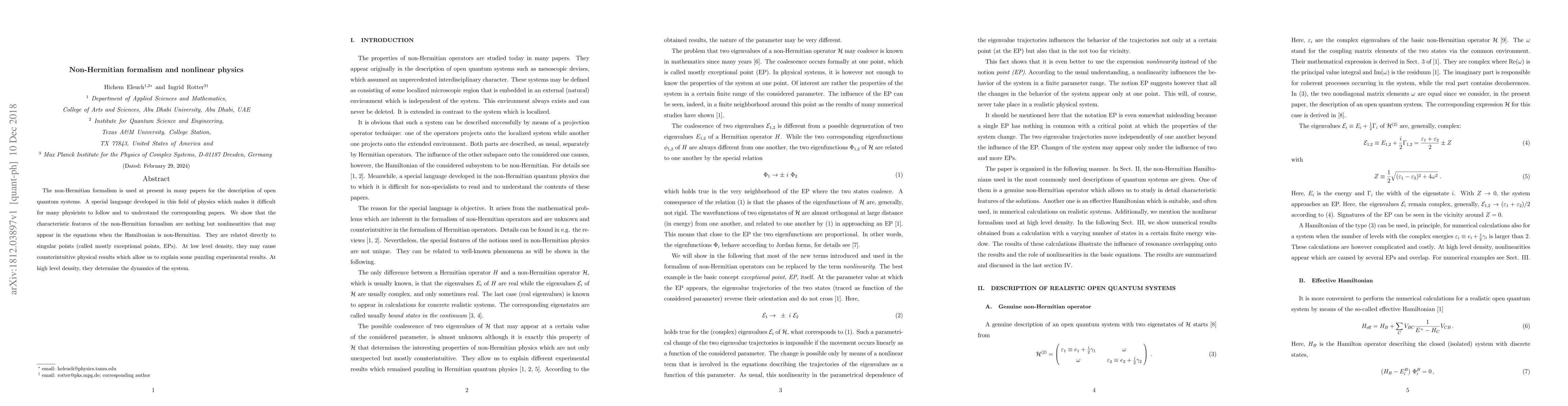 The non-Hermitian formalism is used at present in many papers for the description of open quantum systems. A special language developed in this field of physics which makes it difficult for many physicists to follow and to understand the corresponding papers. We show that the characteristic features of the non-Hermitian formalism are nothing but nonlinearities that may appear in the equations when the Hamiltonian is non-Hermitian. They are related directly to singular points (called mostly exceptional points, EPs). At low level density, they may cause counterintuitive physical results which allow us to explain some puzzling experimental results. At high level density, they determine the dynamics of the system.