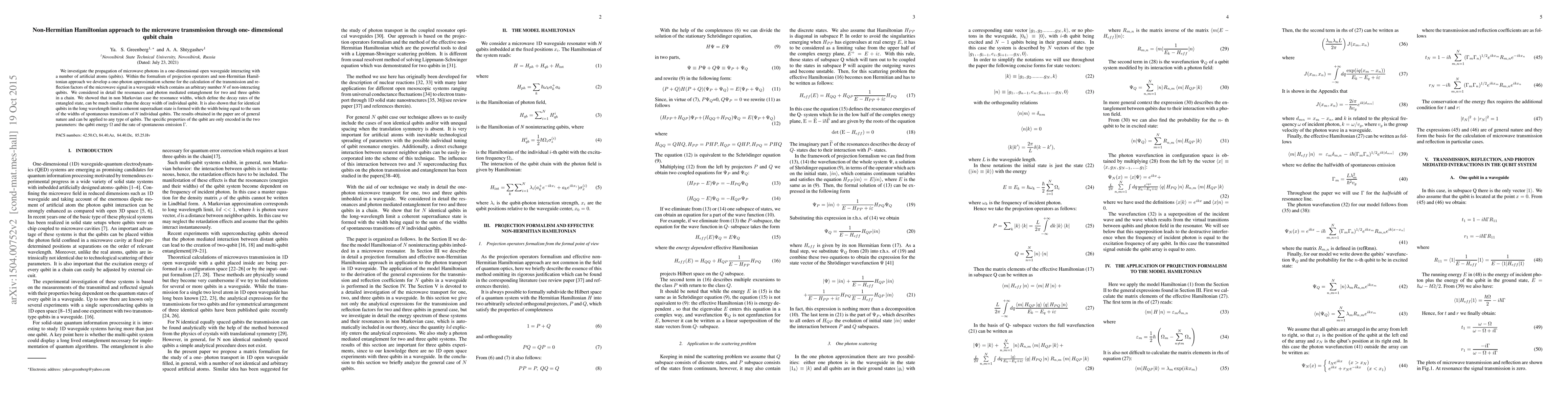 Researchers developed a non-Hermitian Hamiltonian approach to study microwave transmission through a chain of qubits, finding that resonance widths can be much smaller than individual qubit decay rates and leading to coherent superradiant states.