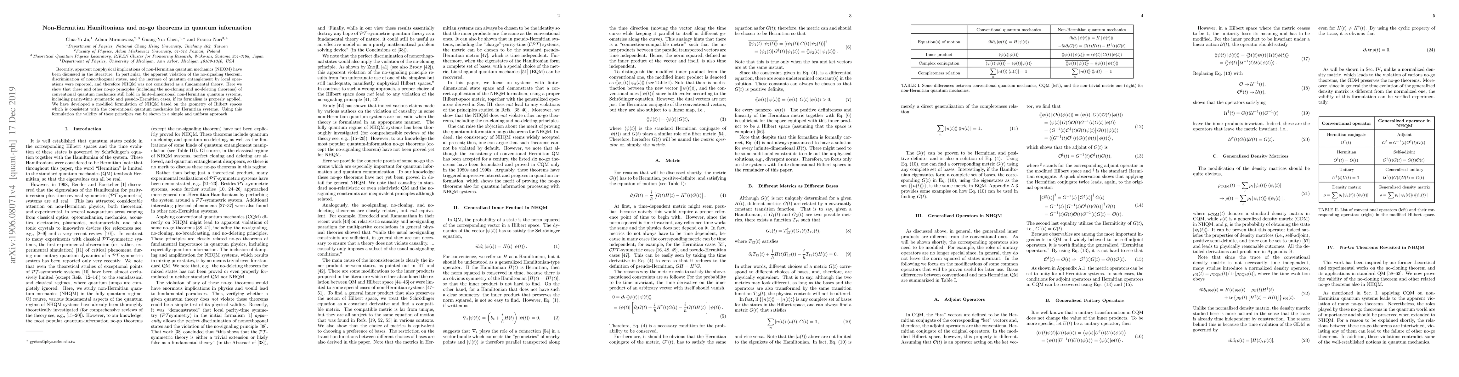 This paper demonstrates that conventional quantum mechanics' no-go theorems, such as no-signaling and no-cloning, remain valid in non-Hermitian quantum systems when properly formulated. The authors propose a modified non-Hermitian quantum mechanics based on the geometry of Hilbert spaces, ensuring consistency with Hermitian systems.