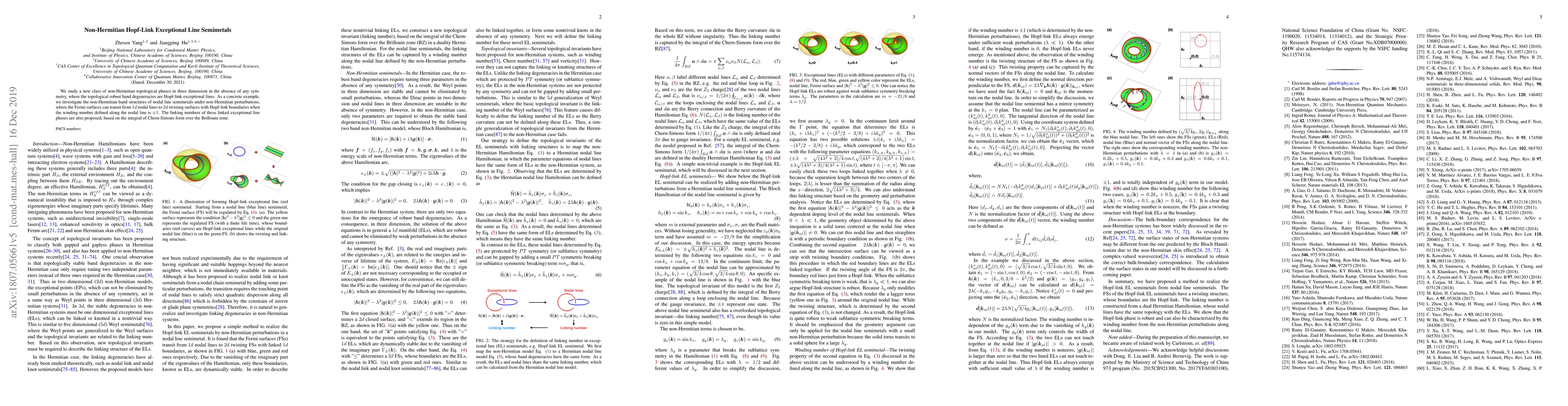 This paper explores non-Hermitian topological phases in 3D without conventional symmetries, focusing on Hopf-link exceptional lines. It examines how nodal line semimetals under non-Hermitian perturbations can transition from 1D nodal lines to 2D surfaces with Hopf-link boundaries, characterized by a winding number of $\pm 1$.