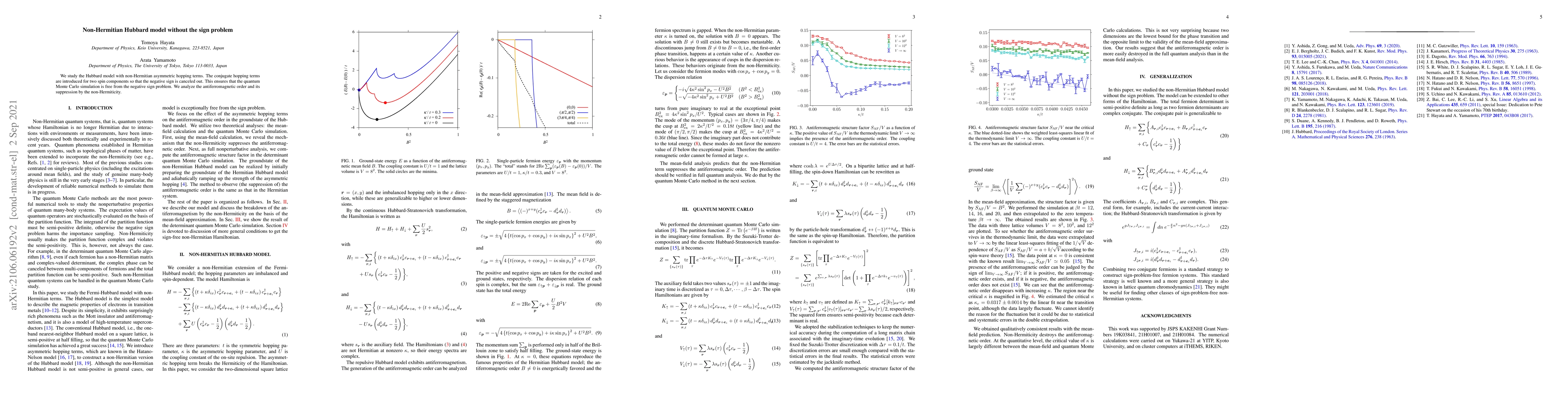 We study the Hubbard model with non-Hermitian asymmetric hopping terms. The conjugate hopping terms are introduced for two spin components so that the negative sign is canceled out. This ensures that the quantum Monte Carlo simulation is free from the negative sign problem. We analyze the antiferromagnetic order and its suppression by the non-Hermiticity.