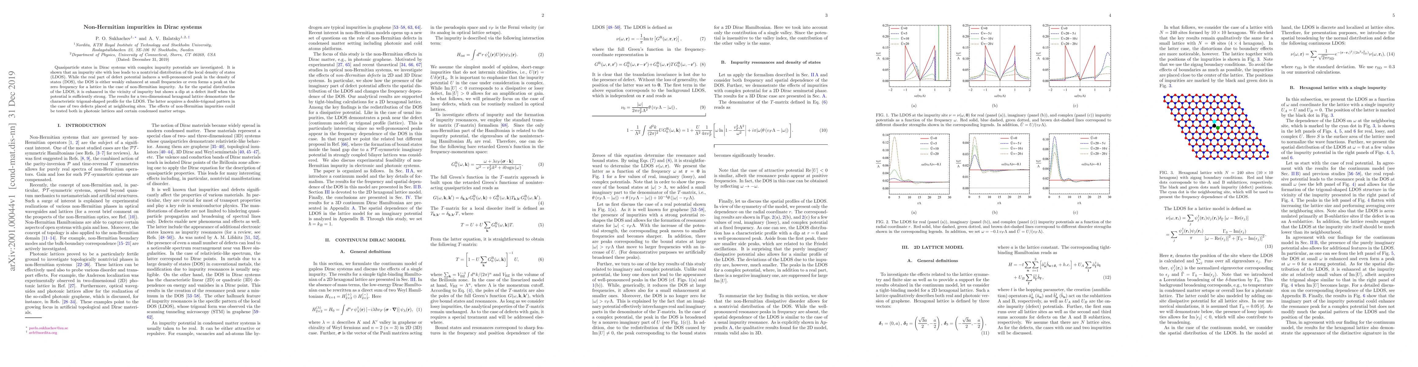 Quasiparticle states in Dirac systems with complex impurity potentials are investigated. It is shown that an impurity site with loss leads to a nontrivial distribution of the local density of states (LDOS). While the real part of defect potential induces a well-pronounced peak in the density of states (DOS), the DOS is either weakly enhanced at small frequencies or even forms a peak at the zero frequency for a lattice in the case of non-Hermitian impurity. As for the spatial distribution of the LDOS, it is enhanced in the vicinity of impurity but shows a dip at a defect itself when the potential is sufficiently strong. The results for a two-dimensional hexagonal lattice demonstrate the characteristic trigonal-shaped profile for the LDOS. The latter acquires a double-trigonal pattern in the case of two defects placed at neighboring sites. The effects of non-Hermitian impurities could be tested both in photonic lattices and certain condensed matter setups.
