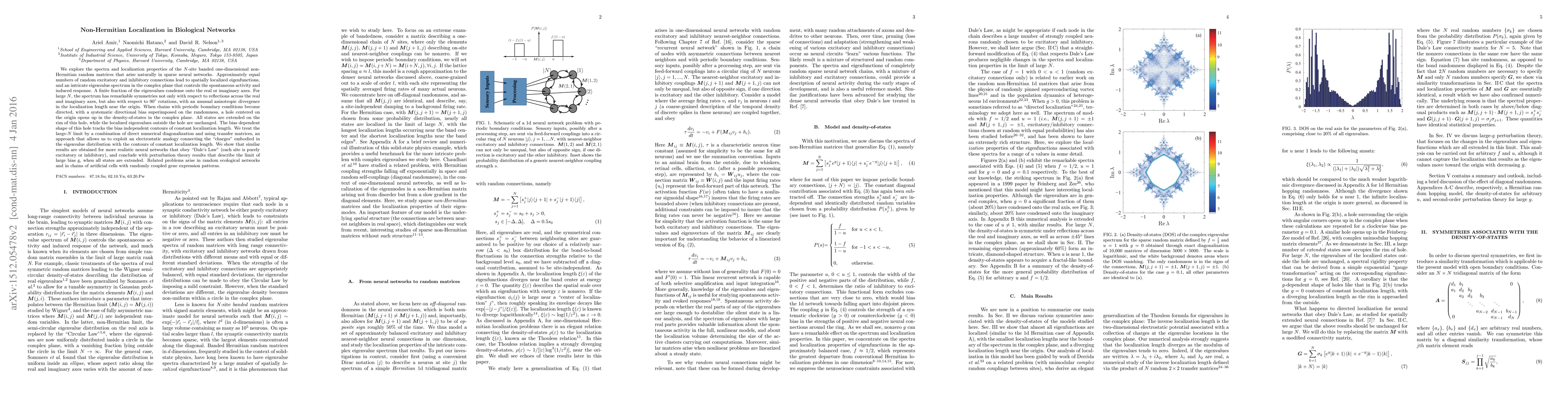 We explore the spectra and localization properties of the N-site banded one-dimensional non-Hermitian random matrices that arise naturally in sparse neural networks. Approximately equal numbers of random excitatory and inhibitory connections lead to spatially localized eigenfunctions, and an intricate eigenvalue spectrum in the complex plane that controls the spontaneous activity and induced response. A finite fraction of the eigenvalues condense onto the real or imaginary axes. For large N, the spectrum has remarkable symmetries not only with respect to reflections across the real and imaginary axes, but also with respect to 90 degree rotations, with an unusual anisotropic divergence in the localization length near the origin. When chains with periodic boundary conditions become directed, with a systematic directional bias superimposed on the randomness, a hole centered on the origin opens up in the density-of-states in the complex plane. All states are extended on the rim of this hole, while the localized eigenvalues outside the hole are unchanged. The bias dependent shape of this hole tracks the bias independent contours of constant localization length. We treat the large-N limit by a combination of direct numerical diagonalization and using transfer matrices, an approach that allows us to exploit an electrostatic analogy connecting the "charges" embodied in the eigenvalue distribution with the contours of constant localization length. We show that similar results are obtained for more realistic neural networks that obey "Dale's Law" (each site is purely excitatory or inhibitory), and conclude with perturbation theory results that describe the limit of large bias g, when all states are extended. Related problems arise in random ecological networks and in chains of artificial cells with randomly coupled gene expression patterns.