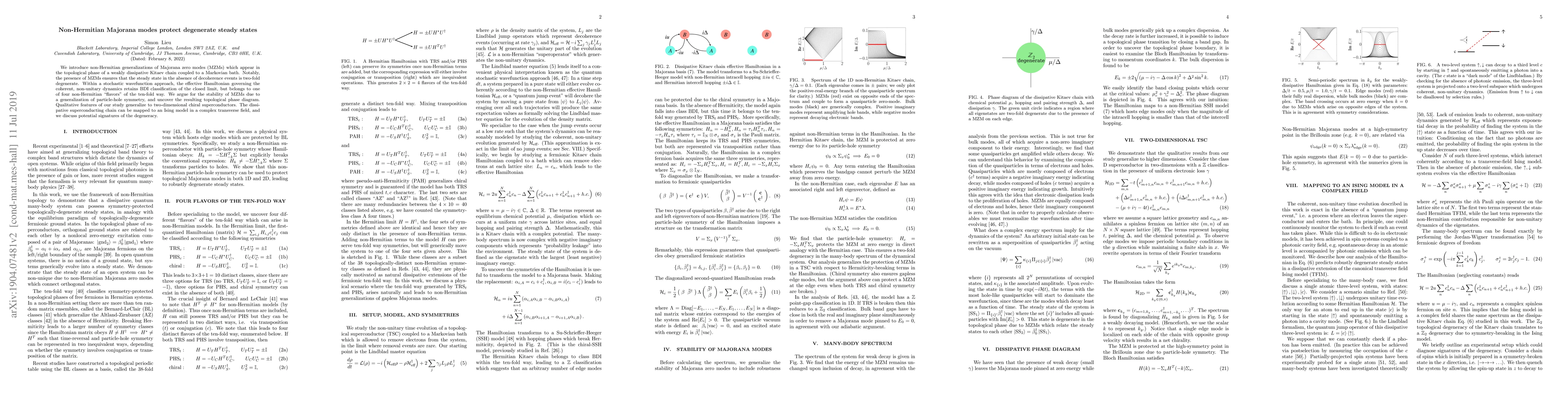 We introduce non-Hermitian generalizations of Majorana zero modes (MZMs) which appear in the topological phase of a weakly dissipative Kitaev chain coupled to a Markovian bath. Notably, the presence of MZMs ensures that the steady state in the absence of decoherence events is two-fold degenerate. Within a stochastic wavefunction approach, the effective Hamiltonian governing the coherent, non-unitary dynamics retains BDI classification of the closed limit, but belongs to one of four non-Hermitian "flavors" of the ten-fold way. We argue for the stability of MZMs due to a generalization of particle-hole symmetry, and uncover the resulting topological phase diagram. Qualitative features of our study generalize to two-dimensional chiral superconductors. The dissipative superconducting chain can be mapped to an Ising model in a complex transverse field, and we discuss potential signatures of the degeneracy.