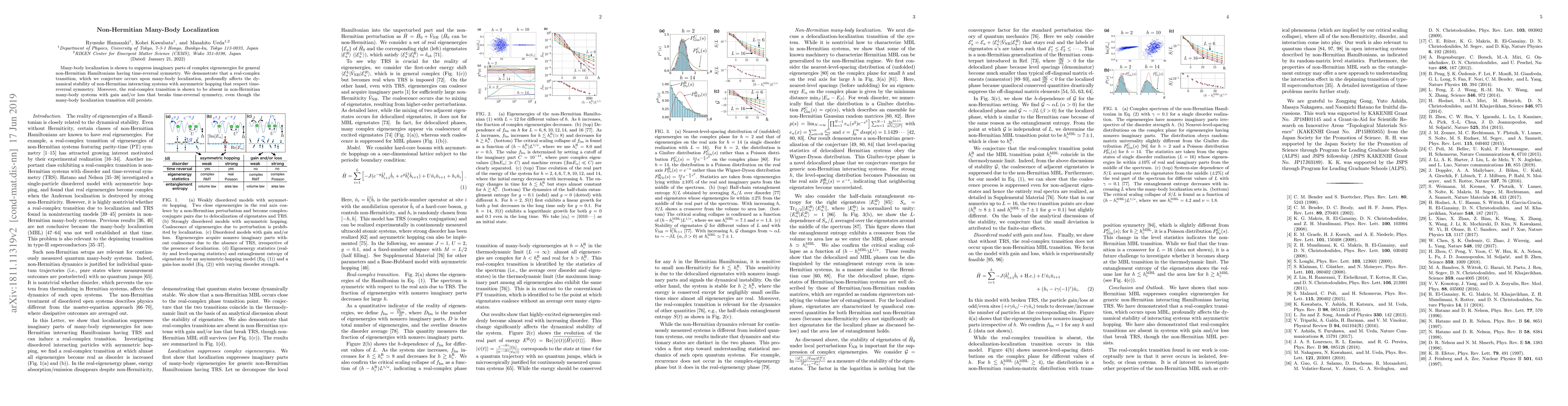 The paper presents a detailed analysis of non-Hermitian MBL, introducing indicators for real-complex transitions and demonstrating their impact on dynamical stability in interacting systems with time-reversal symmetry.