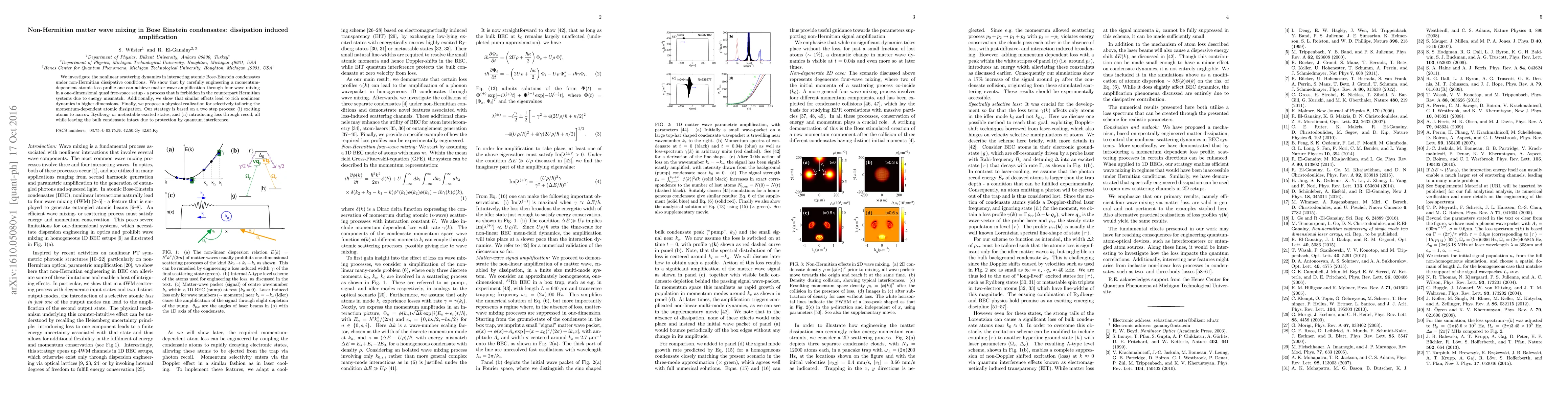 We investigate the nonlinear scattering dynamics in interacting atomic Bose-Einstein condensates under non-Hermitian dissipative conditions. We show that by carefully engineering a momentum-dependent atomic loss profile one can achieve matter-wave amplification through four wave mixing in a one-dimensional quasi free-space setup - a process that is forbidden in the counterpart Hermitian systems due to energy mismatch. Additionally, we show that similar effects lead to rich nonlinear dynamics in higher dimensions. Finally, we propose a physical realization for selectively tailoring the momentum-dependent atomic dissipation. Our strategy is based on a two step process: (i) exciting atoms to narrow Rydberg- or metastable excited states, and (ii) introducing loss through recoil; all while leaving the bulk condensate intact due to protection by quantum interference.