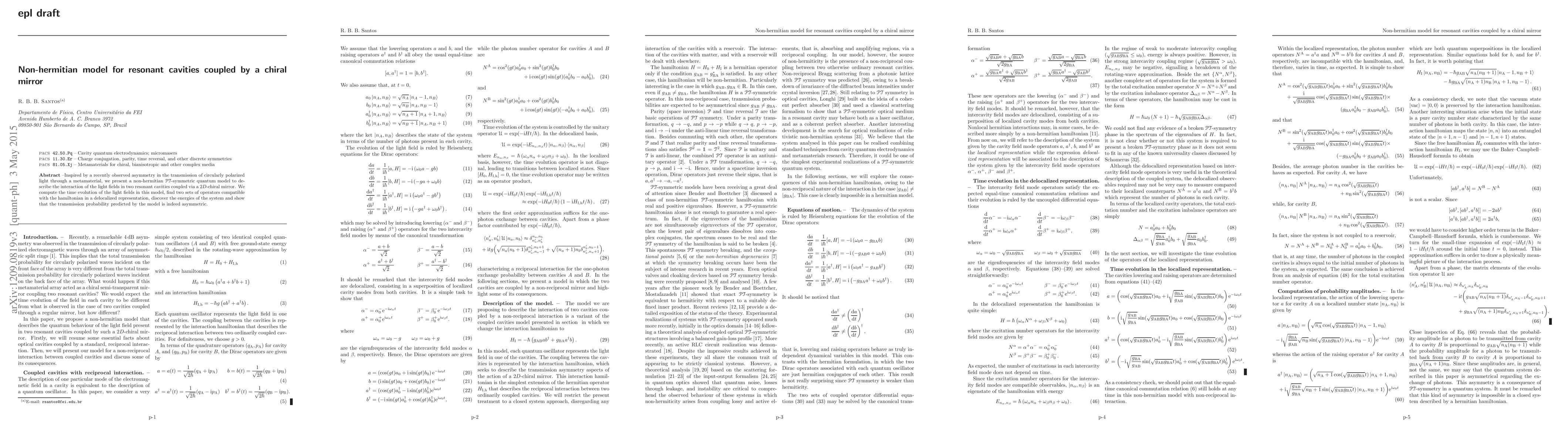 Inspired by a recently observed asymmetry in the transmission of circularly polarized light through a metamaterial, we present a non-hermitian PT-symmetric quantum model to describe the interaction of the light fields in two resonant cavities coupled via a 2D-chiral mirror. We compute the time evolution of the light fields in this model, find two sets of operators compatible with the hamiltonian in a delocalized representation, discover the energies of the system and show that the transmission probability predicted by the model is indeed asymmetric.