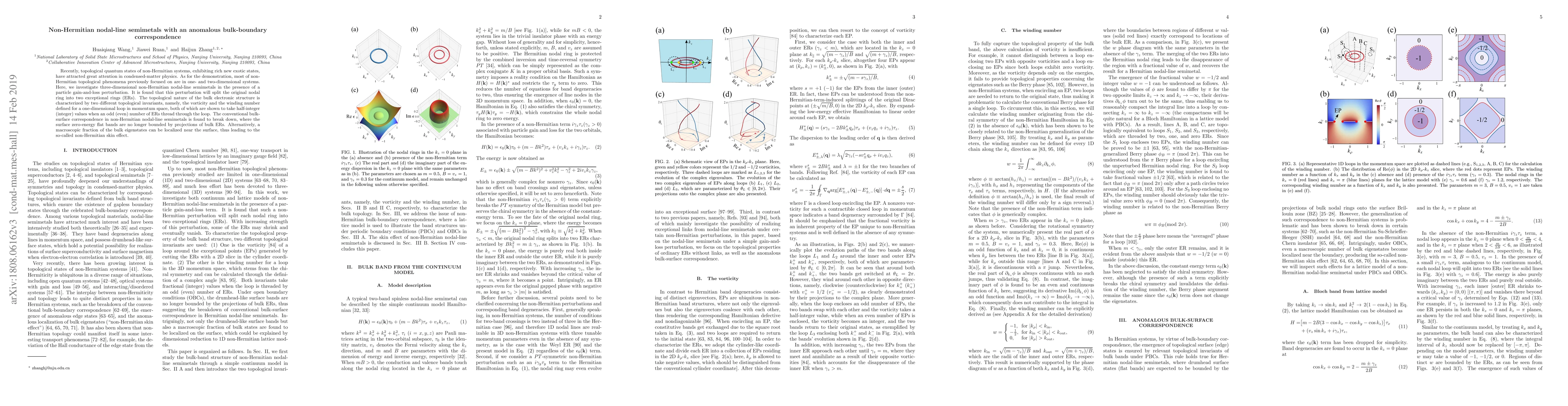 This paper explores three-dimensional non-Hermitian nodal-line semimetals with a particle gain-and-loss perturbation, revealing the splitting of nodal rings into exceptional rings and the breakdown of conventional bulk-surface correspondence, leading to the non-Hermitian skin effect. The topological invariants vorticity and winding number exhibit half-integer values based on the number of exceptional rings threading through a loop in momentum space.