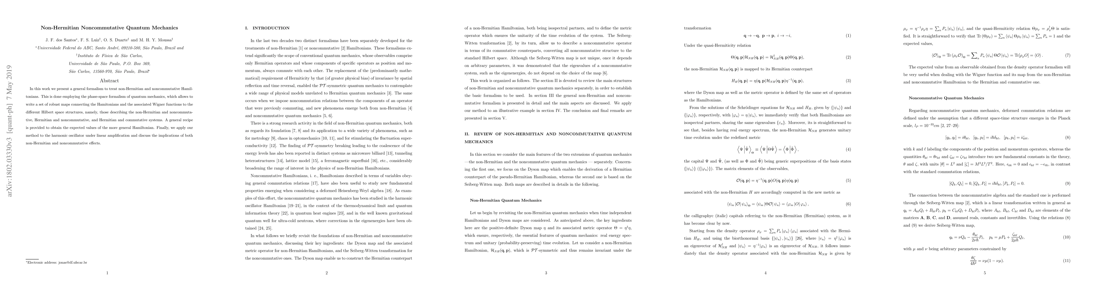 This paper develops a formalism for non-Hermitian and noncommutative quantum mechanics using phase-space methods, providing a way to calculate expected values for general Hamiltonians and applying it to the harmonic oscillator with linear amplification to explore non-Hermitian and noncommutative effects.