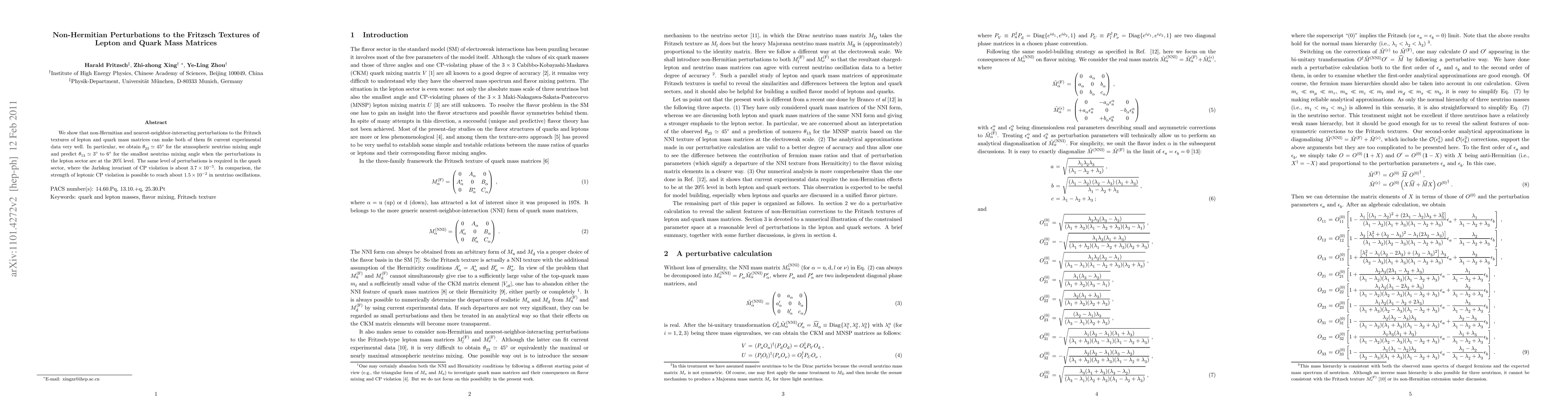 We show that non-Hermitian and nearest-neighbor-interacting perturbations to the Fritzsch textures of lepton and quark mass matrices can make both of them fit current experimental data very well. In particular, we obtain \theta_{23} \simeq 45^\circ for the atmospheric neutrino mixing angle and predict \theta_{13} \simeq 3^\circ to 6^\circ for the smallest neutrino mixing angle when the perturbations in the lepton sector are at the 20% level. The same level of perturbations is required in the quark sector, where the Jarlskog invariant of CP violation is about 3.7 \times 10^{-5}. In comparison, the strength of leptonic CP violation is possible to reach about 1.5 \times 10^{-2} in neutrino oscillations.