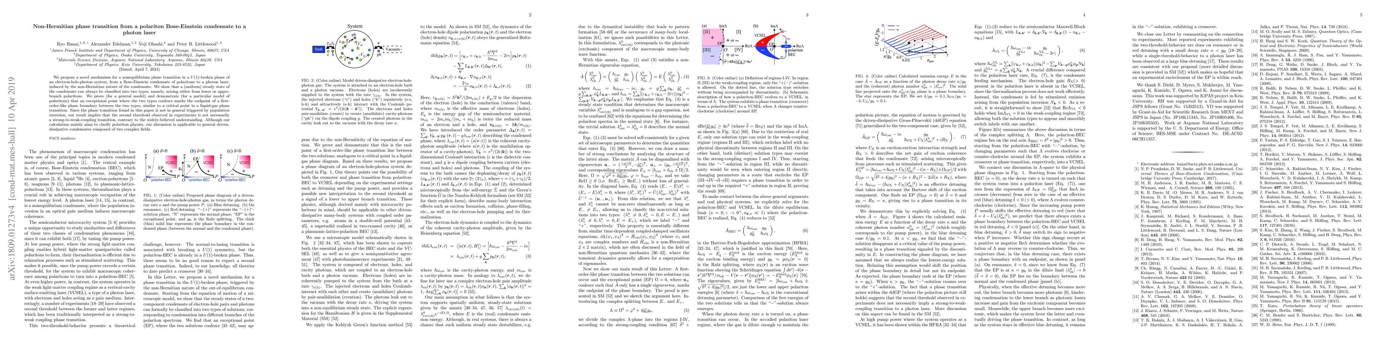 We propose a novel mechanism for a nonequilibrium phase transition in a $U(1)$-broken phase of an electron-hole-photon system, from a Bose-Einstein condensate of polaritons to a photon laser, induced by the non-Hermitian nature of the condensate. We show that a (uniform) steady state of the condensate can always be classified into two types, namely, arising either from lower or upper-branch polaritons. We prove (for a general model) and demonstrate (for a particular model of polaritons) that an exceptional point where the two types coalesce marks the endpoint of a first-order-like phase boundary between the two types, similar to a critical point in a liquid-gas phase transition. Since the phase transition found in this paper is not in general triggered by population inversion, our result implies that the second threshold observed in experiments is not necessarily a strong-to-weak-coupling transition, contrary to the widely-believed understanding. Although our calculation mainly aims to clarify polariton physics, our discussion is applicable to general driven-dissipative condensates composed of two complex fields.