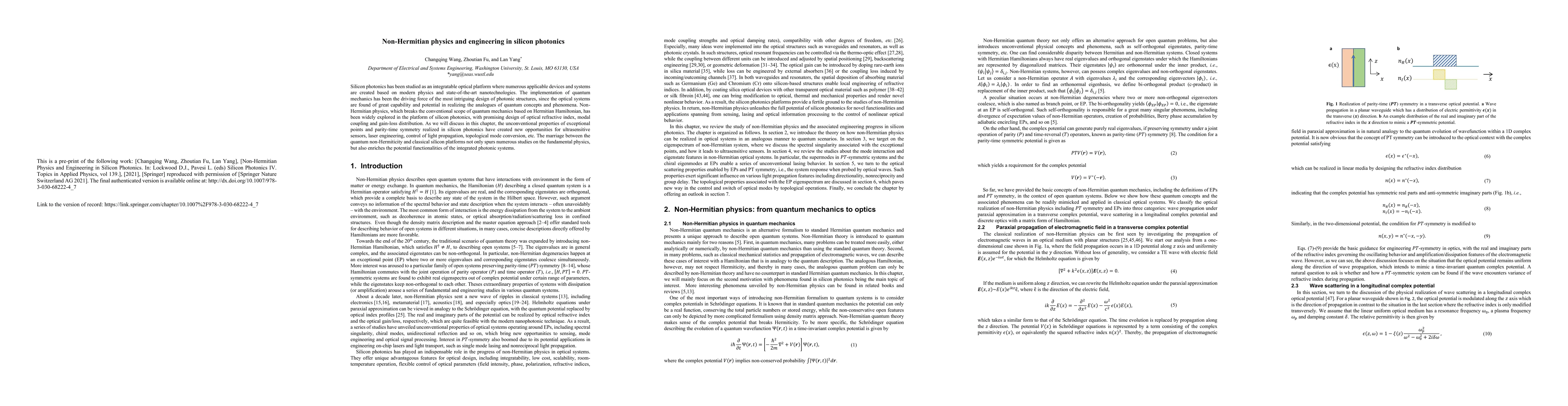 Silicon photonics has been studied as an integratable optical platform where numerous applicable devices and systems are created based on modern physics and state-of-the-art nanotechnologies. The implementation of quantum mechanics has been the driving force of the most intriguing design of photonic structures, since the optical systems are found of great capability and potential in realizing the analogues of quantum concepts and phenomena. Non-Hermitian physics, which breaks the conventional scope of quantum mechanics based on Hermitian Hamiltonian, has been widely explored in the platform of silicon photonics, with promising design of optical refractive index, modal coupling and gain-loss distribution. As we will discuss in this chapter, the unconventional properties of exceptional points and parity-time symmetry realized in silicon photonics have created new opportunities for ultrasensitive sensors, laser engineering, control of light propagation, topological mode conversion, etc. The marriage between the quantum non-Hermiticity and classical silicon platforms not only spurs numerous studies on the fundamental physics, but also enriches the potential functionalities of the integrated photonic systems.