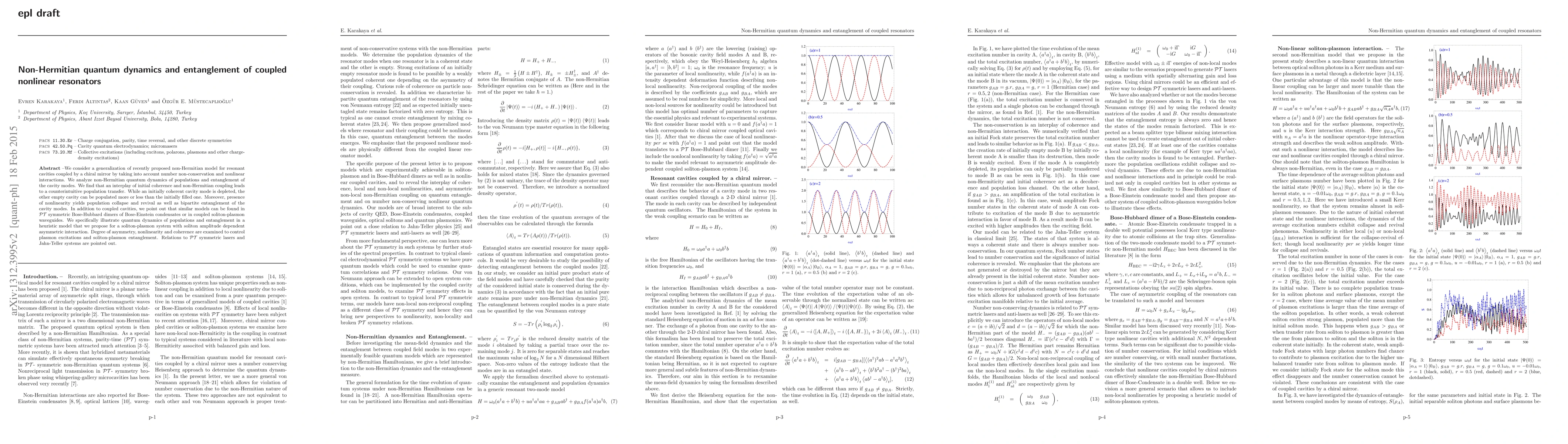 We consider a generalization of recently proposed non-Hermitian model for resonant cavities coupled by a chiral mirror by taking into account number non-conservation and nonlinear interactions. We analyze non-Hermitian quantum dynamics of populations and entanglement of the cavity modes. We find that an interplay of initial coherence and non-Hermitian coupling leads to a counterintuitive population transfer. While an initially coherent cavity mode is depleted, the other empty cavity can be populated more or less than the initially filled one. Moreover, presence of nonlinearity yields population collapse and revival as well as bipartite entanglement of the cavity modes. In addition to coupled cavities, we point out that similar models can be found in $\mathcal{PT}$ symmetric Bose-Hubbard dimers of Bose-Einstein condensates or in coupled soliton-plasmon waveguides. We specifically illustrate quantum dynamics of populations and entanglement in a heuristic model that we propose for a soliton-plasmon system with soliton amplitude dependent asymmetric interaction. Degree of asymmetry, nonlinearity and coherence are examined to control plasmon excitations and soliton-plasmon entanglement. Relations to $\mathcal{PT}$ symmetric lasers and Jahn-Teller systems are pointed out.