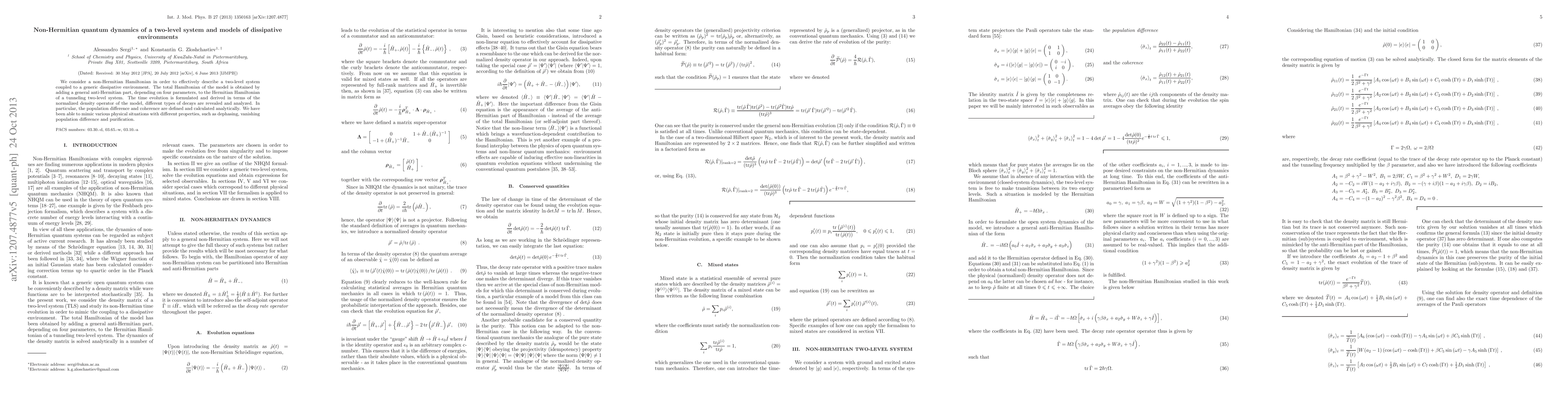 The paper presents a comprehensive analytical treatment of non-Hermitian quantum dynamics for a two-level system, providing explicit solutions for density matrix elements and trace under various decay conditions.