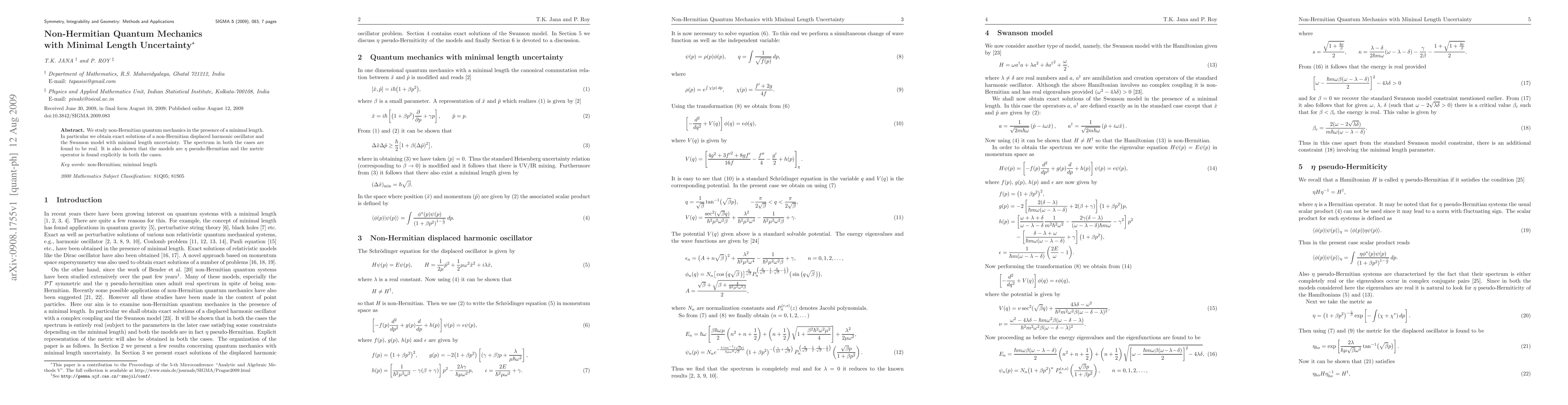 This paper explores non-Hermitian quantum mechanics incorporating a minimal length uncertainty, deriving exact solutions for a displaced harmonic oscillator and the Swanson model. Both models exhibit real spectra and are shown to be $\eta$ pseudo-Hermitian, with explicit expressions for the metric operator.