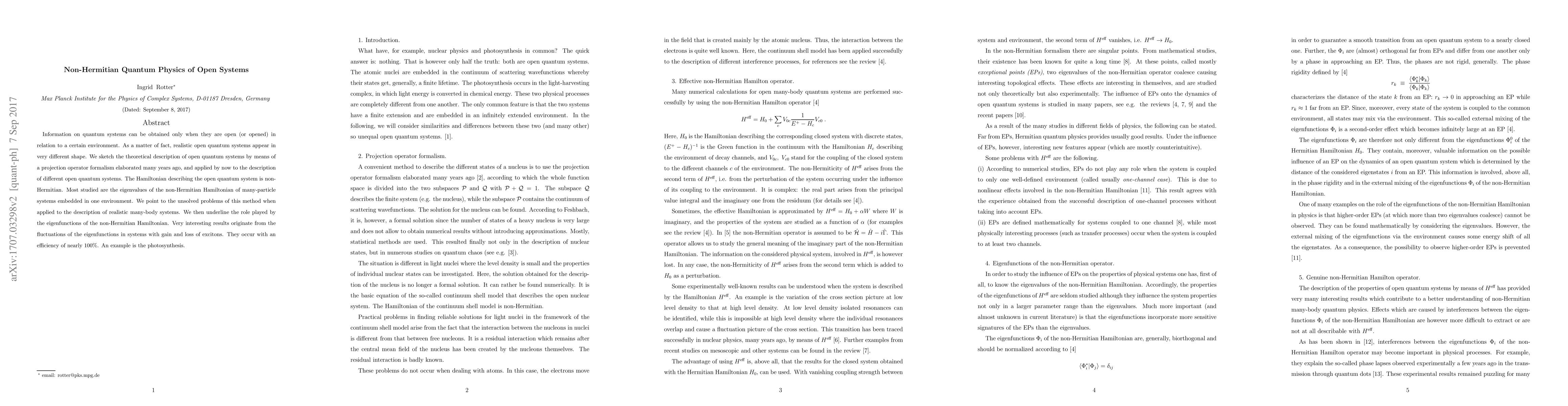 Information on quantum systems can be obtained only when they are open (or opened) in relation to a certain environment. As a matter of fact, realistic open quantum systems appear in very different shape. We sketch the theoretical description of open quantum systems by means of a projection operator formalism elaborated many years ago, and applied by now to the description of different open quantum systems. The Hamiltonian describing the open quantum system is non-Hermitian. Most studied are the eigenvalues of the non-Hermitian Hamiltonian of many-particle systems embedded in one environment. We point to the unsolved problems of this method when applied to the description of realistic many-body systems. We then underline the role played by the eigenfunctions of the non-Hermitian Hamiltonian. Very interesting results originate from the fluctuations of the eigenfunctions in systems with gain and loss of excitons. They occur with an efficiency of nearly 100\%. An example is the photosynthesis.