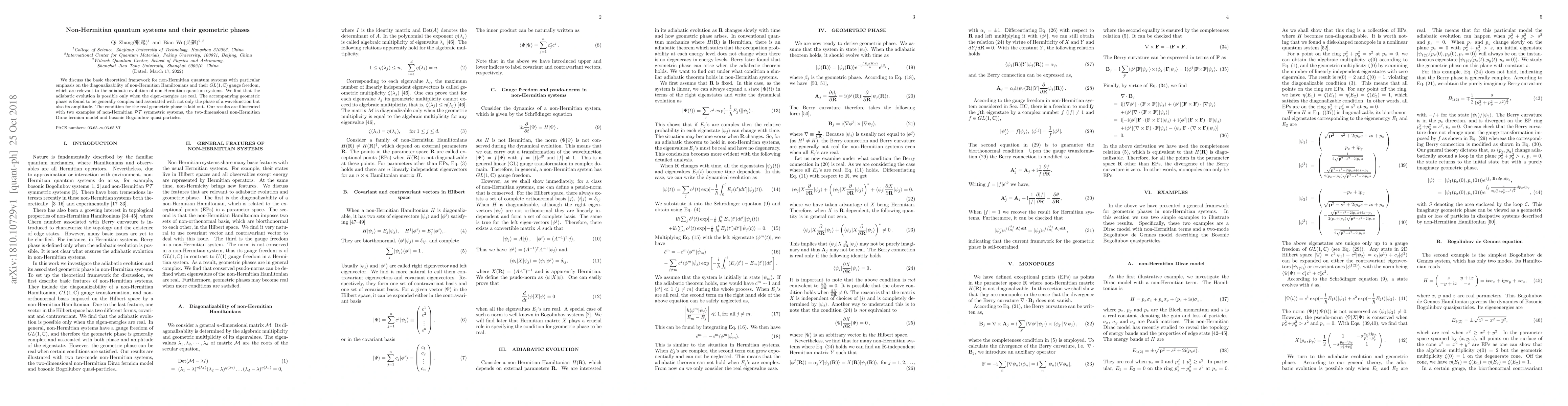 This paper explores the theoretical framework of non-Hermitian quantum systems, focusing on the diagonalizability and gauge freedom of their Hamiltonians. It reveals that real eigen-energies are necessary for adiabatic evolution, and the geometric phase is generally complex, linked to both wavefunction phase and amplitude, with conditions for a real geometric phase outlined. Examples include non-Hermitian $\mathcal{PT}$ symmetric systems like the Dirac fermion model and Bogoliubov quasi-particles.