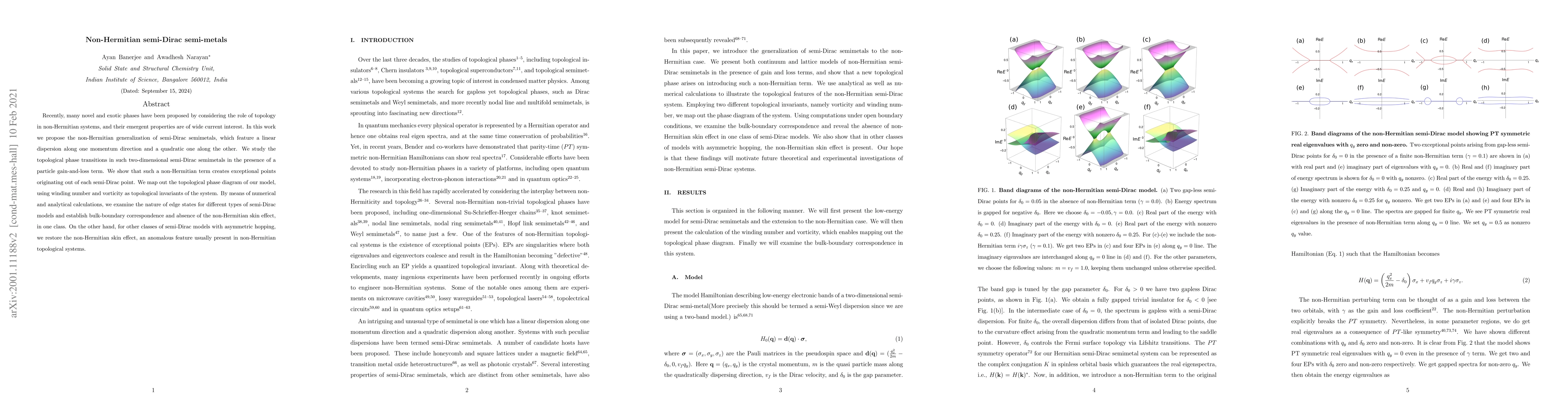 Recently, many novel and exotic phases have been proposed by considering the role of topology in non-Hermitian systems, and their emergent properties are of wide current interest. In this work we propose the non-Hermitian generalization of semi-Dirac semimetals, which feature a linear dispersion along one momentum direction and a quadratic one along the other. We study the topological phase transitions in such two-dimensional semi-Dirac semimetals in the presence of a particle gain-and-loss term. We show that such a non-Hermitian term creates exceptional points originating out of each semi-Dirac point. We map out the topological phase diagram of our model, using winding number and vorticity as topological invariants of the system. By means of numerical and analytical calculations, we examine the nature of edge states for different types of semi-Dirac models and establish bulk-boundary correspondence and absence of the non-Hermitian skin effect, in one class. On the other hand, for other classes of semi-Dirac models with asymmetric hopping, we restore the non-Hermitian skin effect, an anomalous feature usually present in non-Hermitian topological systems.