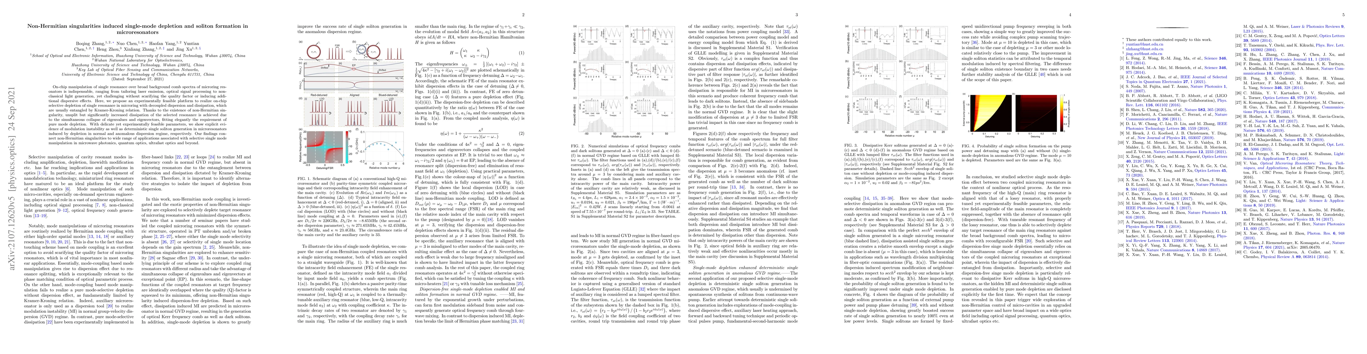 This paper proposes a method for on-chip selective depletion of a single resonance in microring resonators using non-Hermitian singularities, achieving increased dissipation without sacrificing quality factor. It demonstrates modulation instability and soliton generation, with potential applications across various photonic fields.