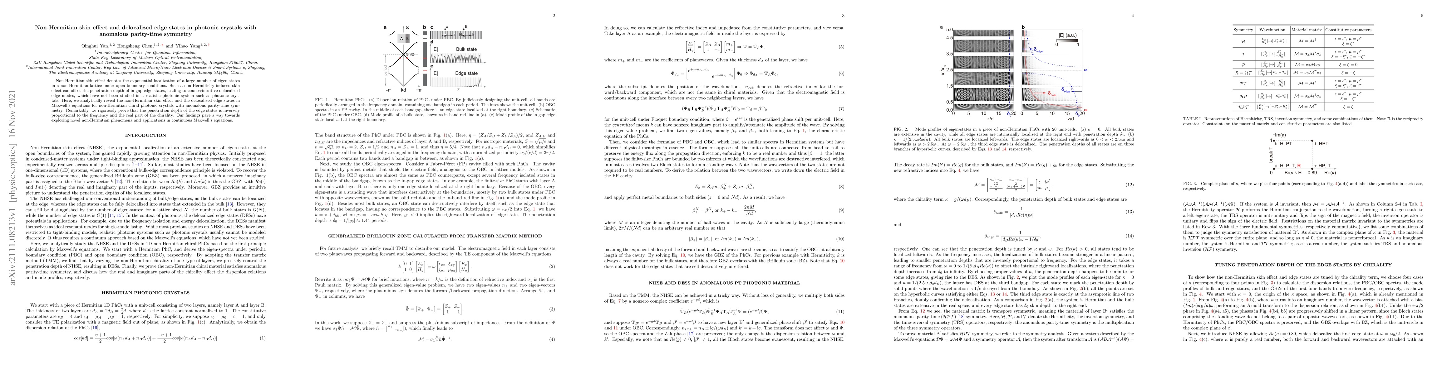 The research paper investigates the non-Hermitian skin effect and delocalized edge states in photonic crystals exhibiting anomalous parity-time symmetry. It analytically demonstrates the localization of eigenstates and reveals counterintuitive delocalized edge modes in chiral photonic crystals, establishing a relationship between edge state penetration depth and frequency and chirality.
