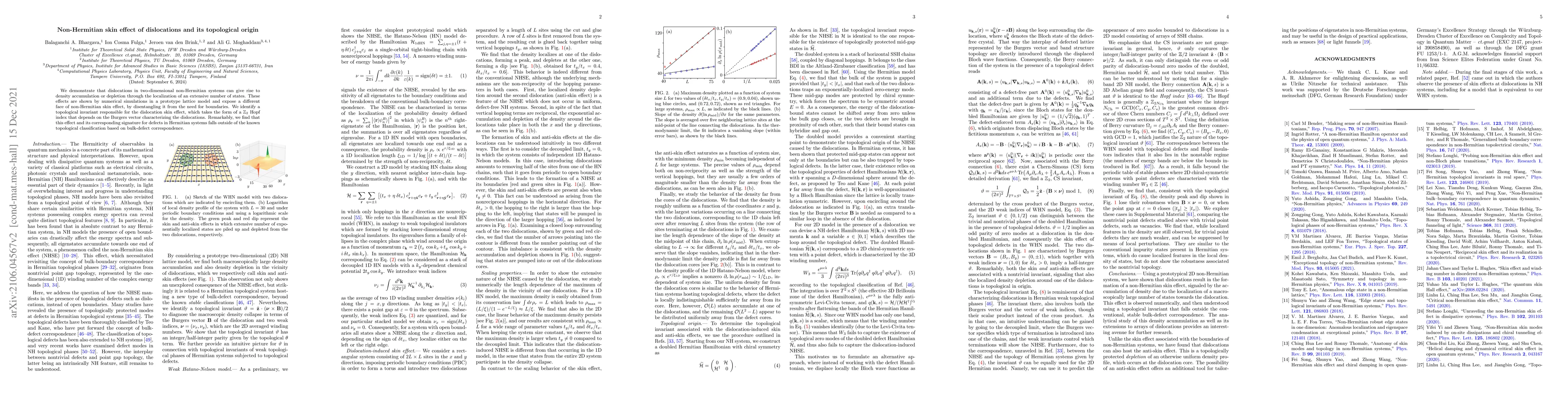 We demonstrate that dislocations in two-dimensional non-Hermitian systems can give rise to density accumulation or depletion through the localization of an extensive number of states. These effects are shown by numerical simulations in a prototype lattice model and expose a different face of non-Hermitian skin effect, by disentangling it from the need for boundaries. We identify a topological invariant responsible for the dislocation skin effect, which takes the form of a ${\mathbb Z}_2$ Hopf index that depends on the Burgers vector characterizing the dislocations. Remarkably, we find that this effect and its corresponding signature for defects in Hermitian systems falls outside of the known topological classification based on bulk-defect correspondence.