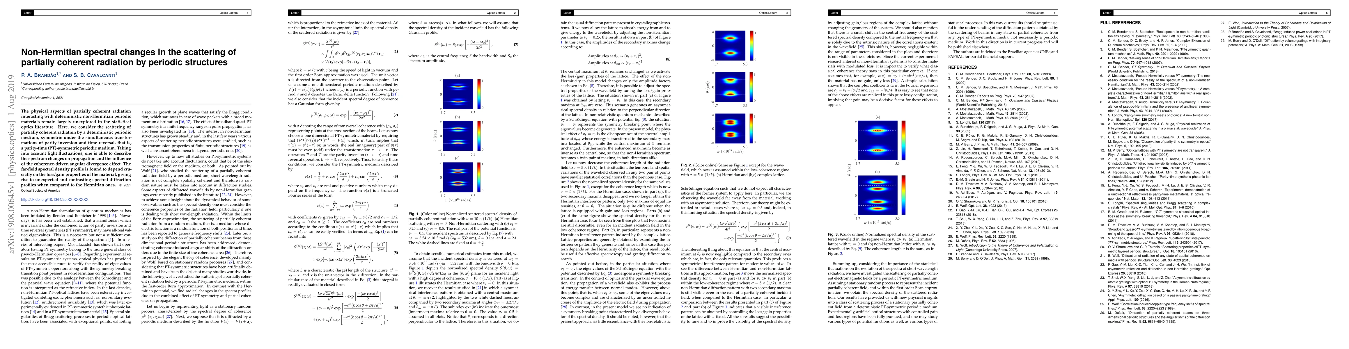 This paper explores the scattering of partially coherent radiation by PT-symmetric periodic materials, revealing significant spectral changes in the diffraction pattern due to the material's loss/gain properties, and highlighting the influence of coherence-driven angular divergence. The findings contrast with traditional Hermitian diffraction profiles.