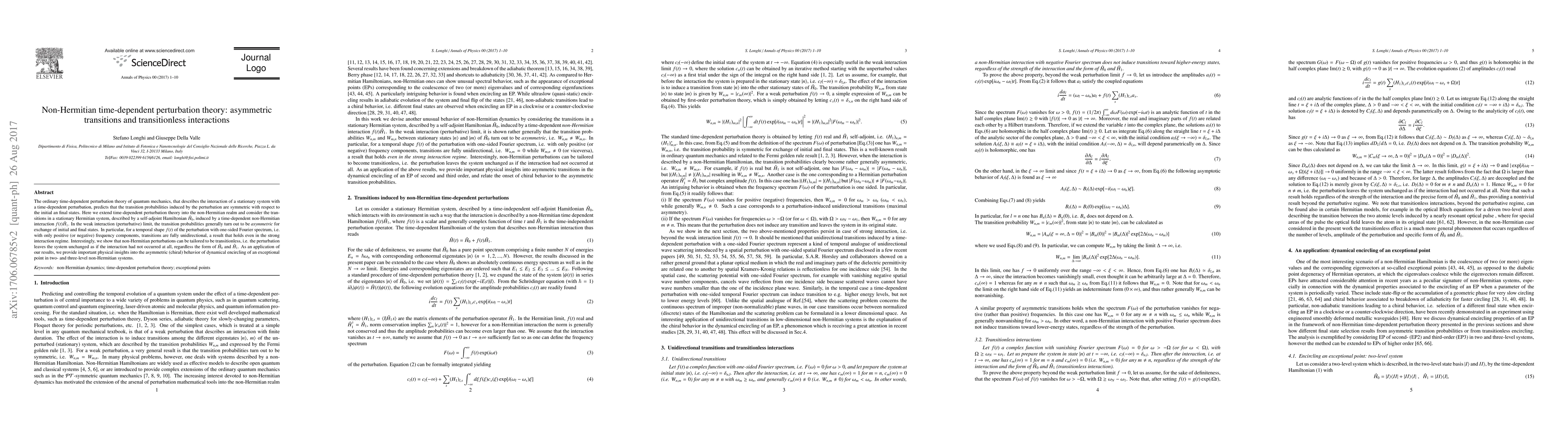 This paper extends time-dependent perturbation theory to non-Hermitian systems, revealing asymmetric transition probabilities and unidirectional transitions under specific perturbation conditions. It also demonstrates transitionless interactions, where perturbations leave the system unchanged, and applies these findings to chiral behavior in encircling exceptional points.