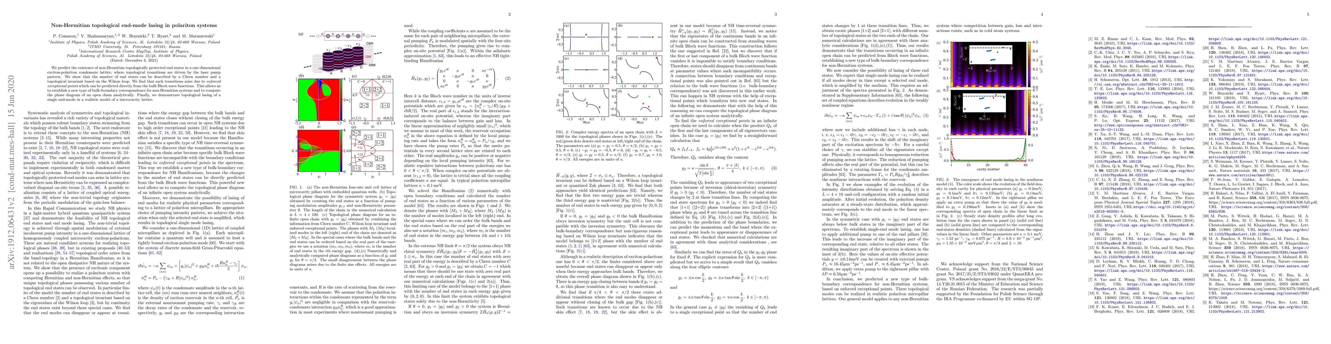 The paper predicts non-Hermitian topologically protected end states in exciton-polariton systems, driven by laser pump patterns, and establishes a new bulk-boundary correspondence for non-Hermitian systems. The study also demonstrates topological lasing of a single end-mode in a microcavity lattice.